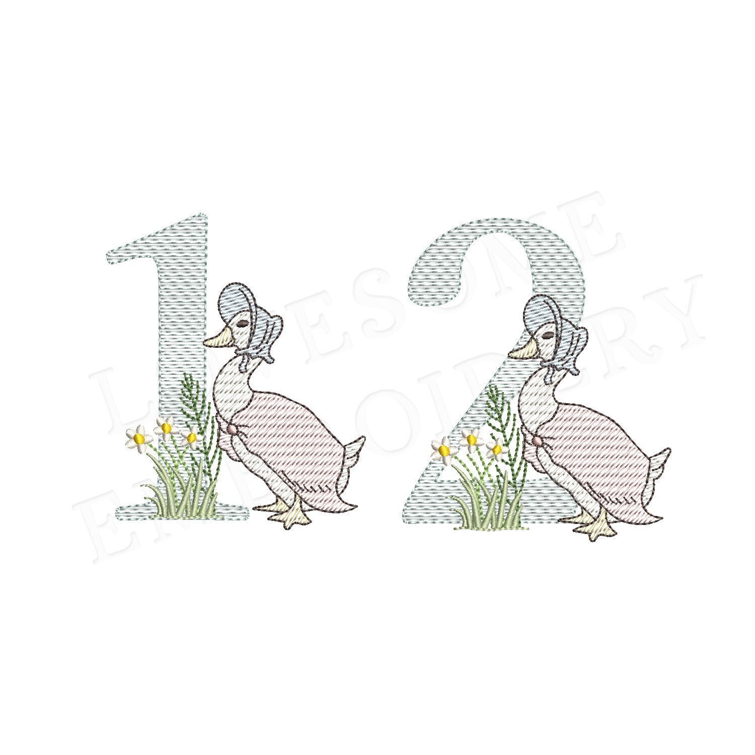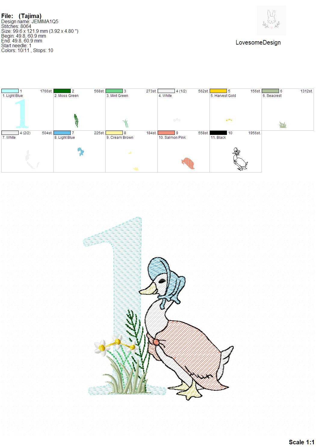 This listing features a machine embroidery numbers set which includes embroidery files of ten numbers (0-9) with Jemima Puddleduck design in 5inch size all in quick stitch (aka sketch fill) for 5x7 hoops for machine embroidery. (For the whole set, pls see the listing images.)