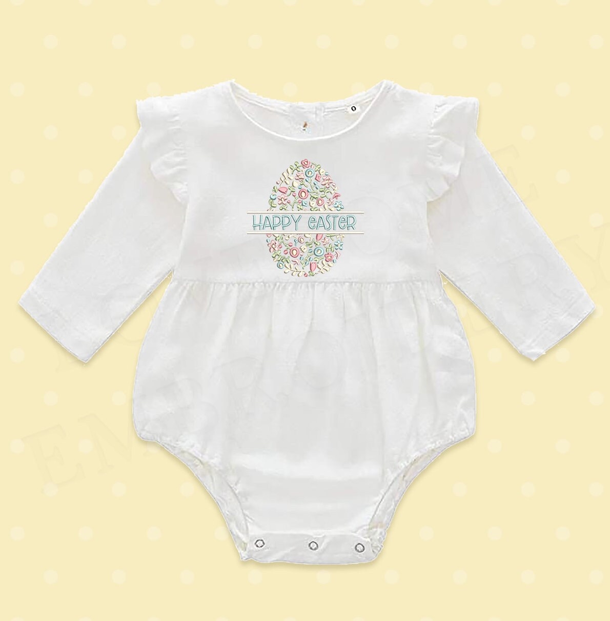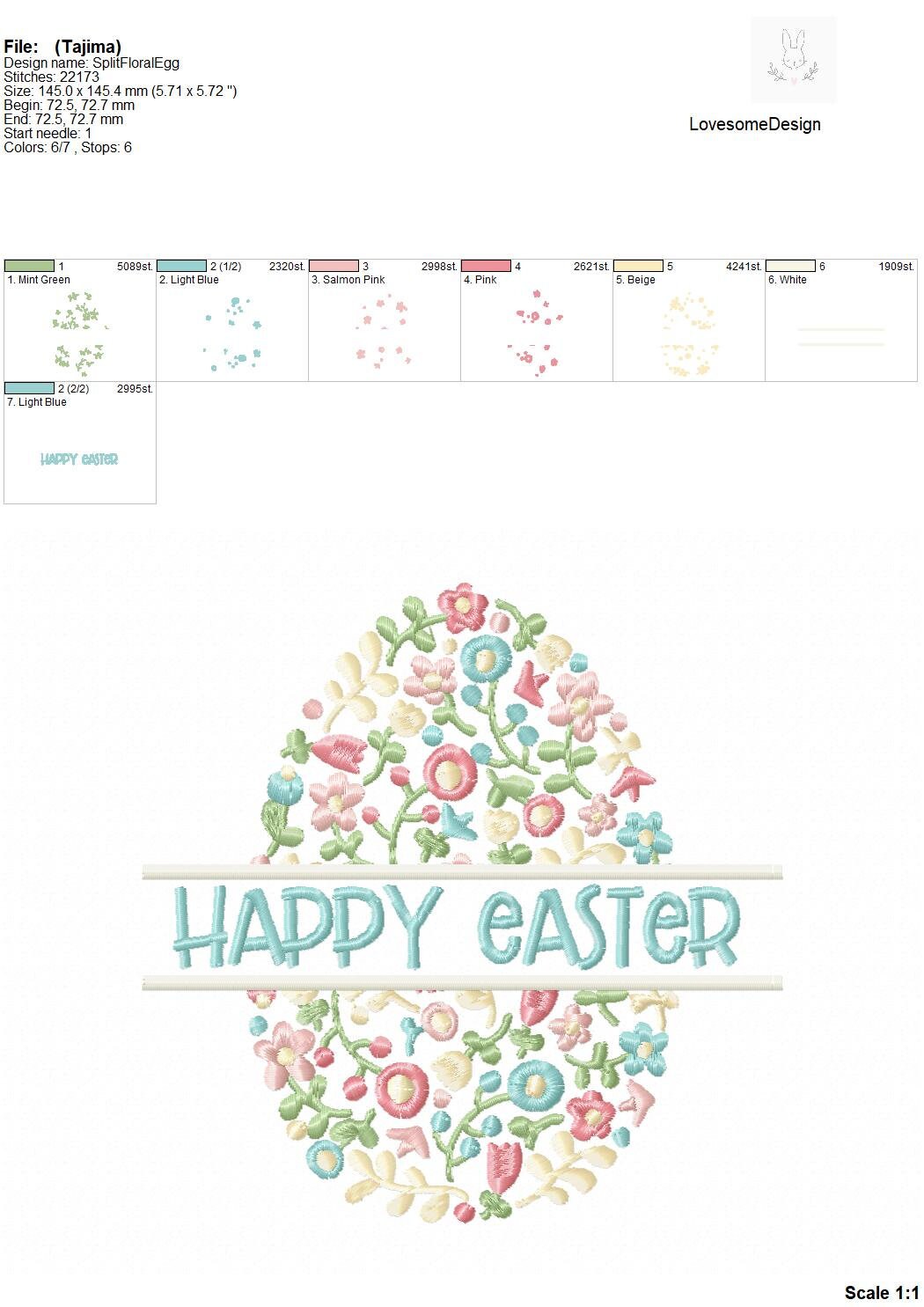 This listing features a machine embroidery file of floral fill split egg with a "Happy Easter" lettering in 6 inch size. Lettering is included. You may stitch your own text by changing the last step of the file.