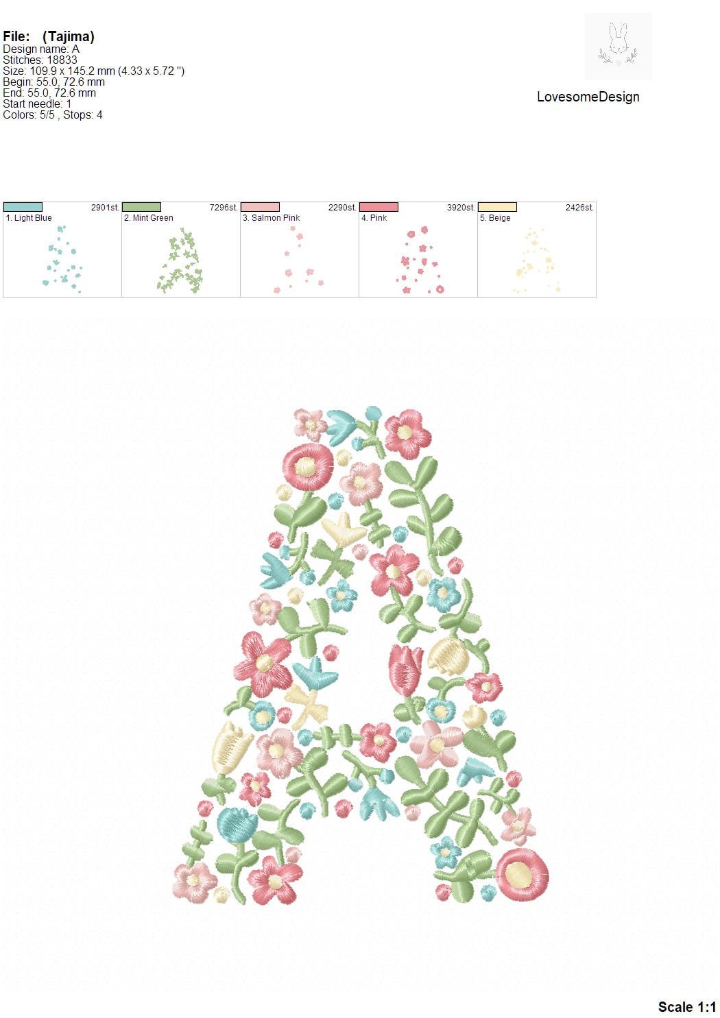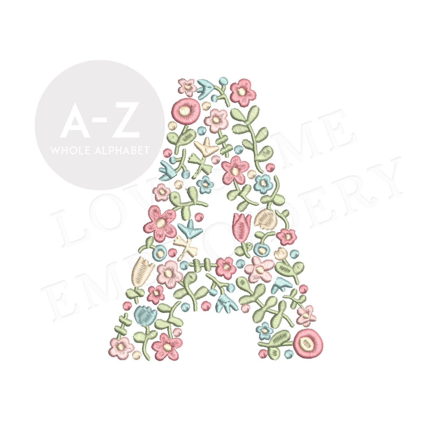This listing features a machine embroidery font set which includes embroidery files of 26 uppercase dainty floral fill letters with pastel spring colors in 6inch size. For the whole set, pls see the listing images.