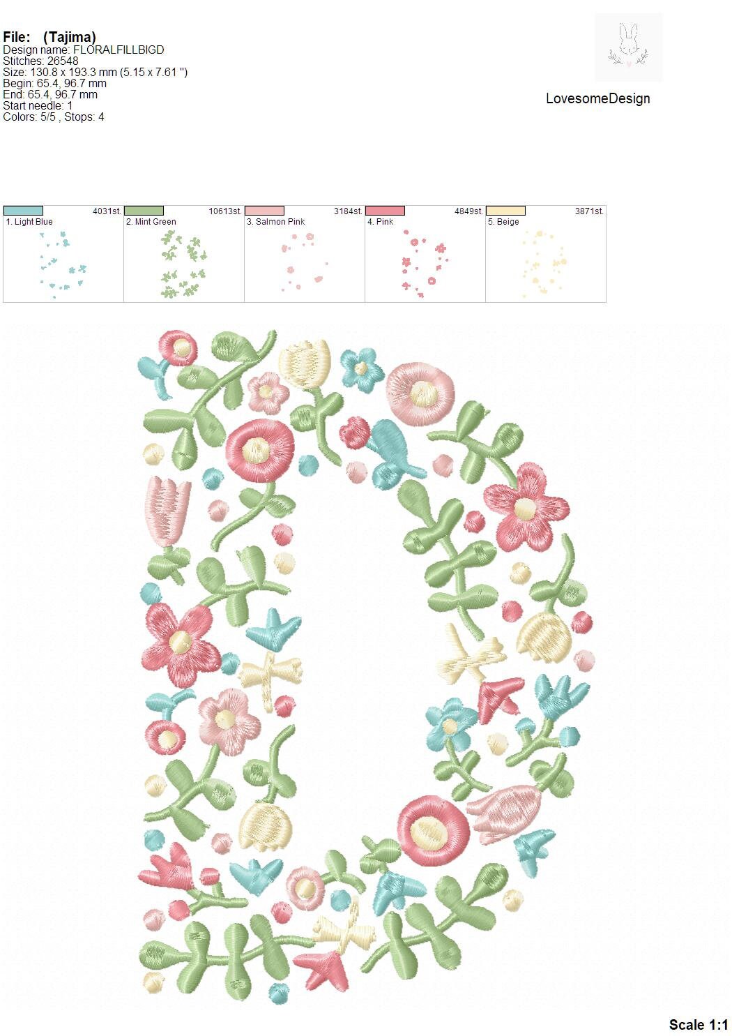 This listing features a machine embroidery file of one uppercase letter "D" which has a beautiful dainty floral fill design with pastel spring colors in 8inch size.
