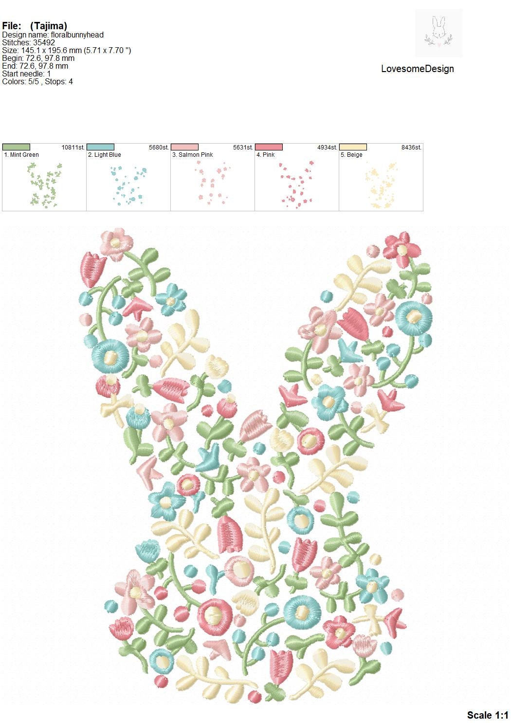 This listing features a machine embroidery file of floral fill bunny head in 8 inch size.