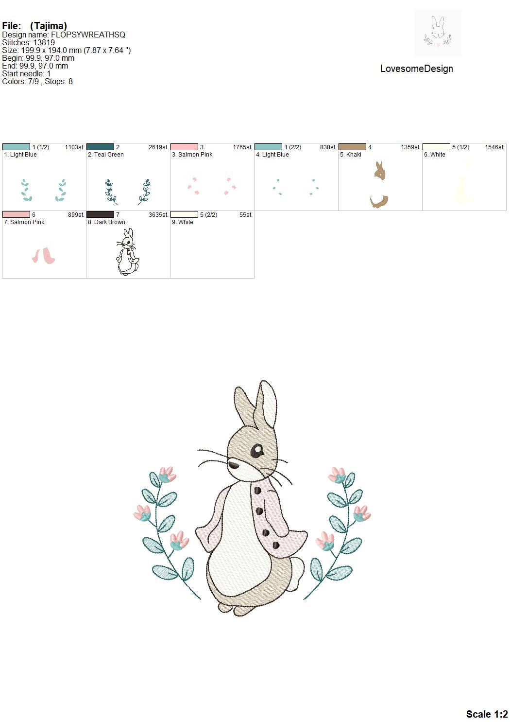 This listing features a machine embroidery file of Flopsy Rabbit with a wreath design in quick stitch (aka sketch fill) in 8 inch size.