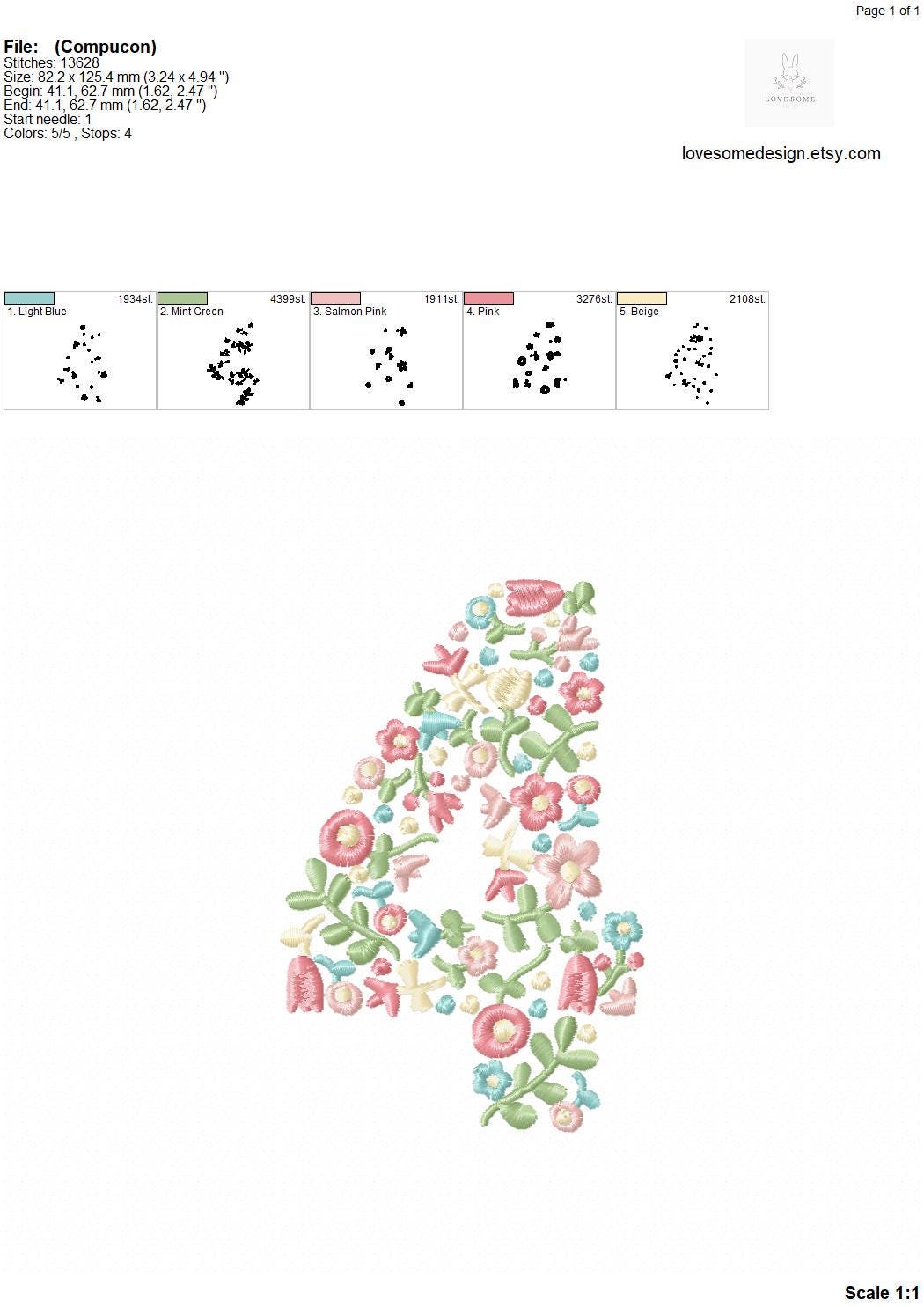 This listing features a machine embroidery font set which includes embroidery files of 10 dainty floral fill numbers 0-9 with pastel spring colors in 5inch size. For the whole set, pls see the listing images.