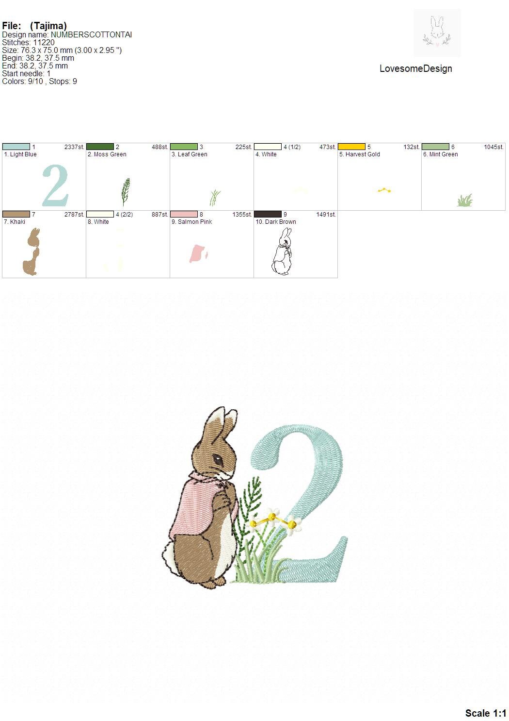 This listing features a machine embroidery numbers set which includes embroidery files of ten numbers (0-9) with Cottontail Rabbit design in 3inch size for 4x4 hoops for machine embroidery. (For the whole set, pls see the listing images.)