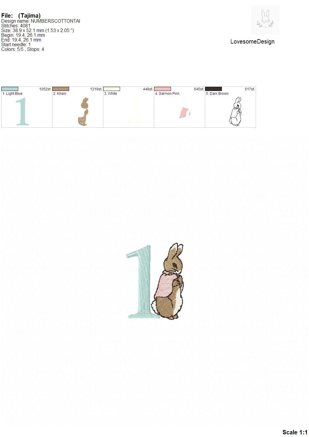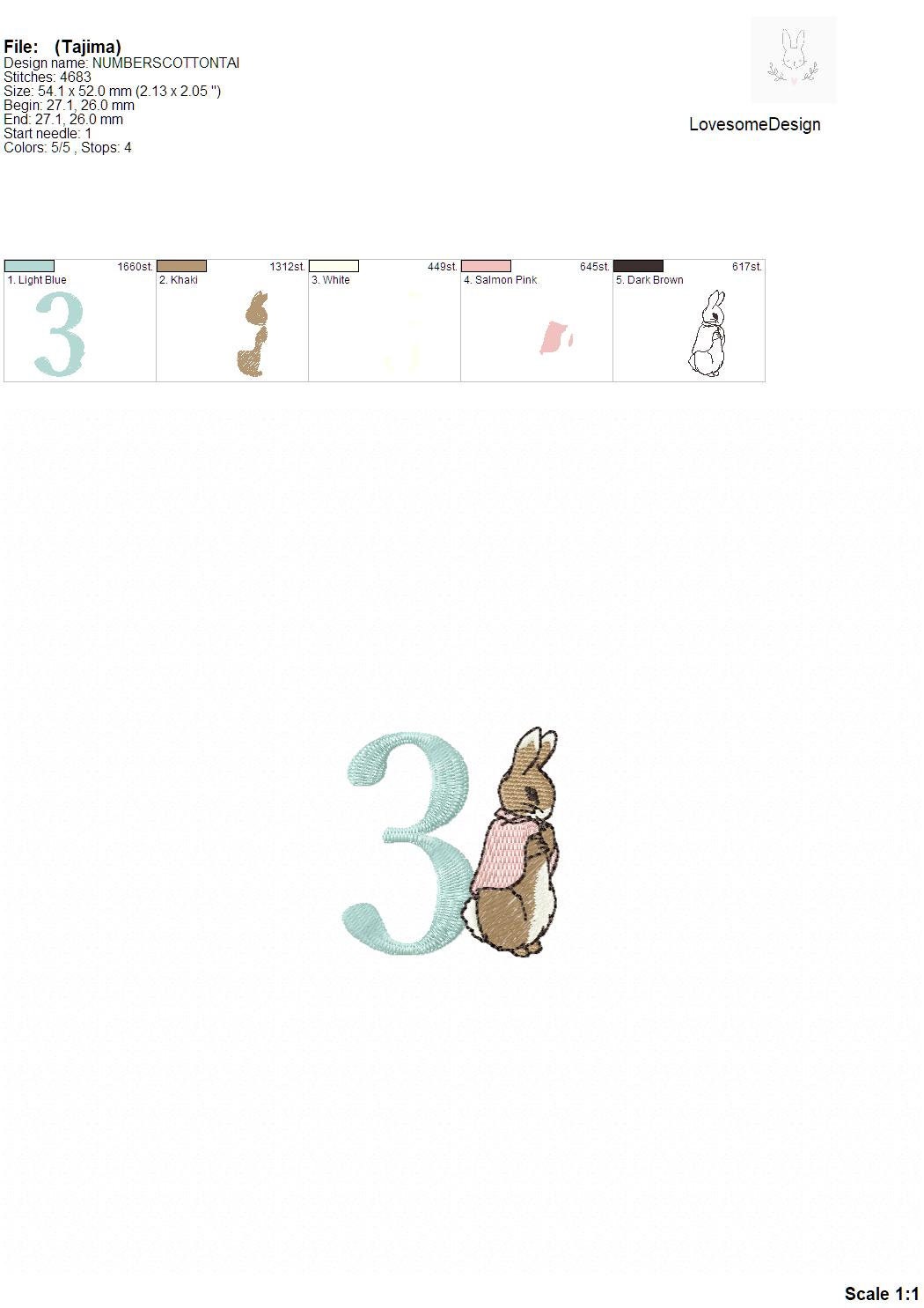 This listing features a machine embroidery numbers set which includes embroidery files of ten numbers (0-9) with Cottontail Rabbit design in 2inch size for 4x4 hoops for machine embroidery. (For the whole set, pls see the listing images.)