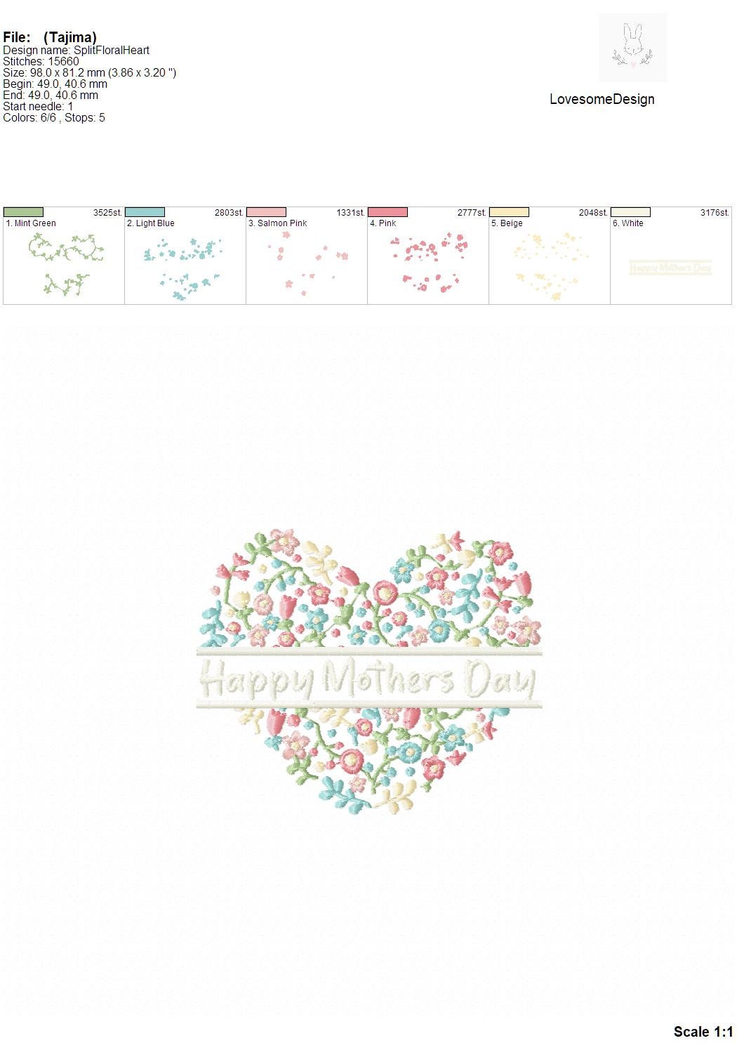 Happy Mothers Day 4inch Floral Fill Heart Split Embroidery Design Machine Embroidery File Digital Download | Lovesome Design