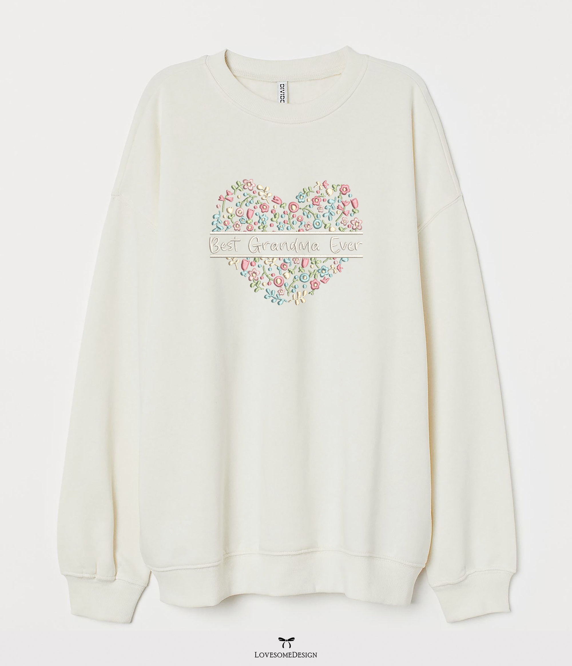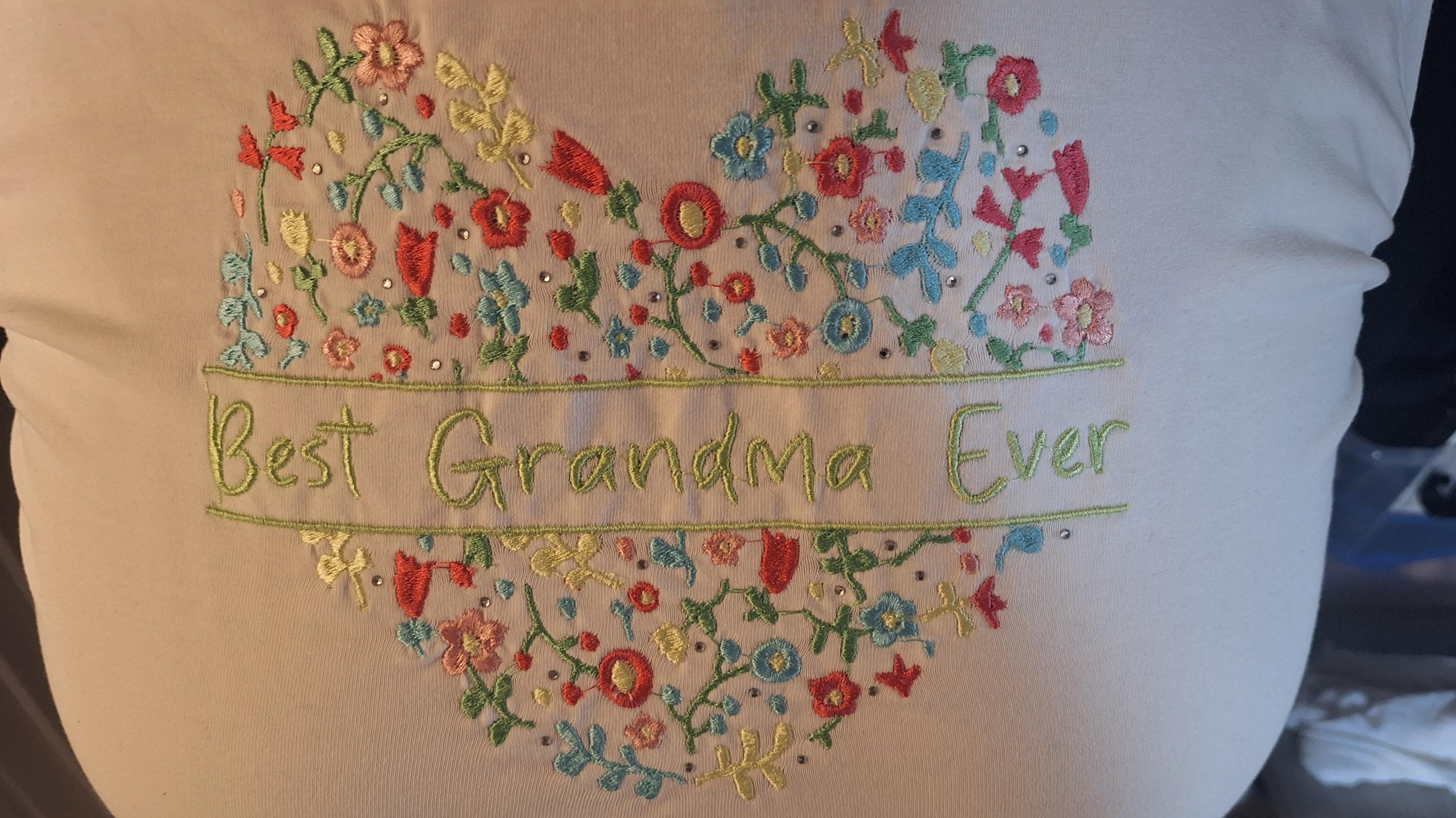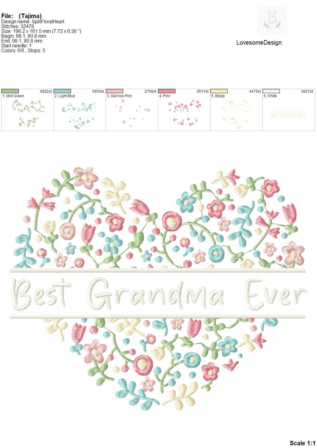 This listing features a machine embroidery file of floral fill split heart with a lettering "Best Grandma Ever" in 8 inch size.