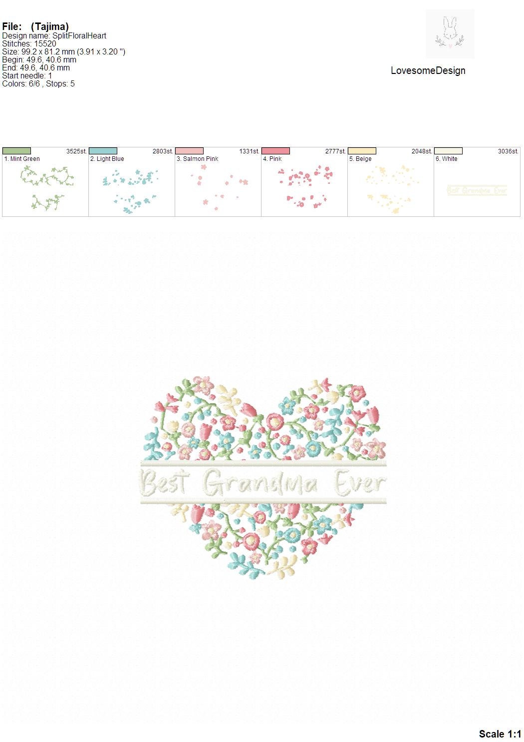 Best Grandma Ever 4inch Floral Fill Heart Split Embroidery Design Machine Embroidery File Digital Download | Lovesome Design