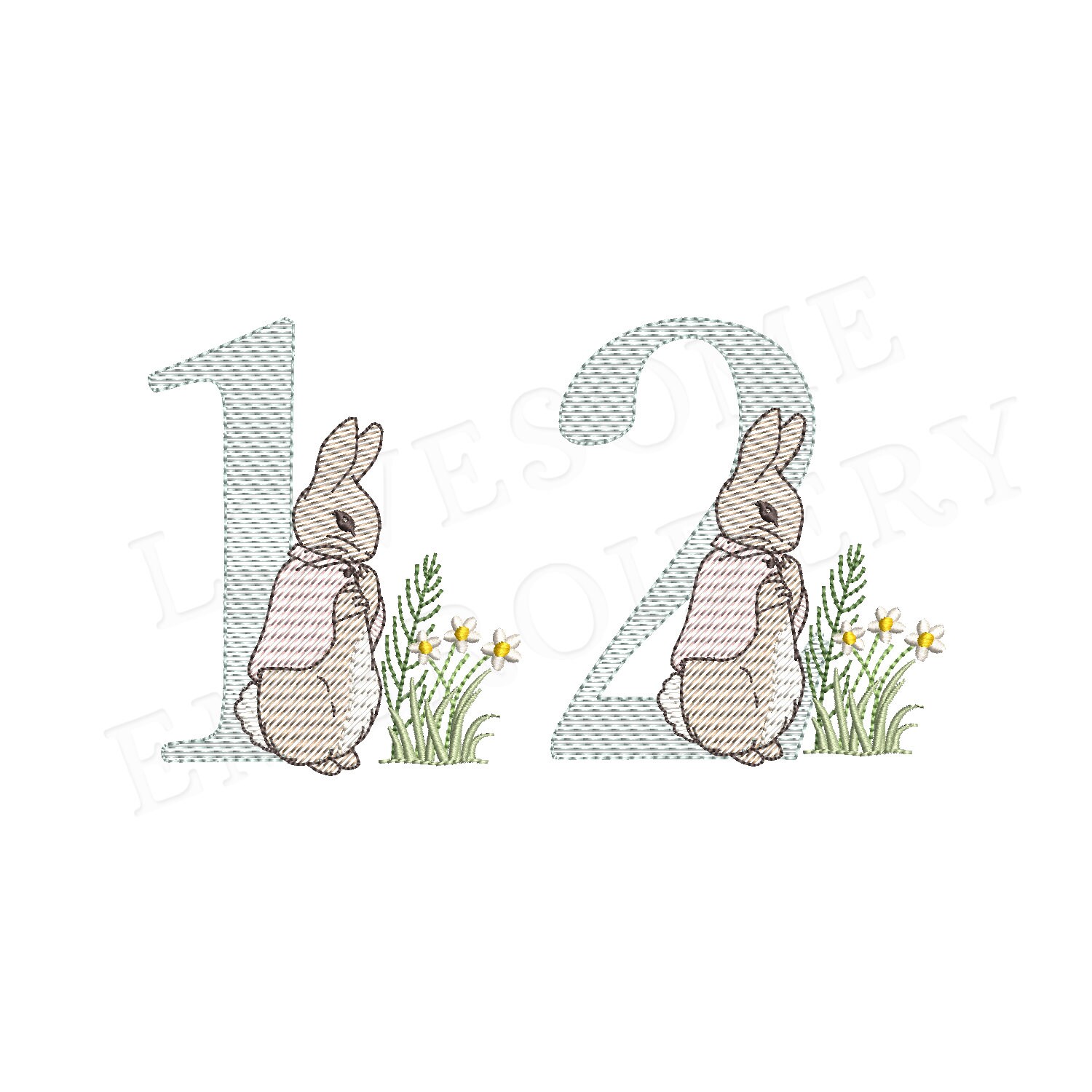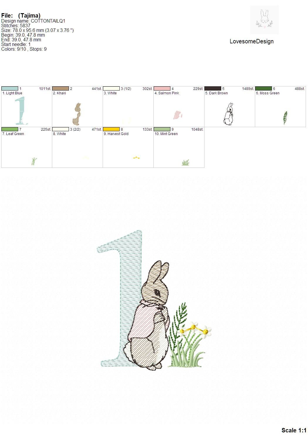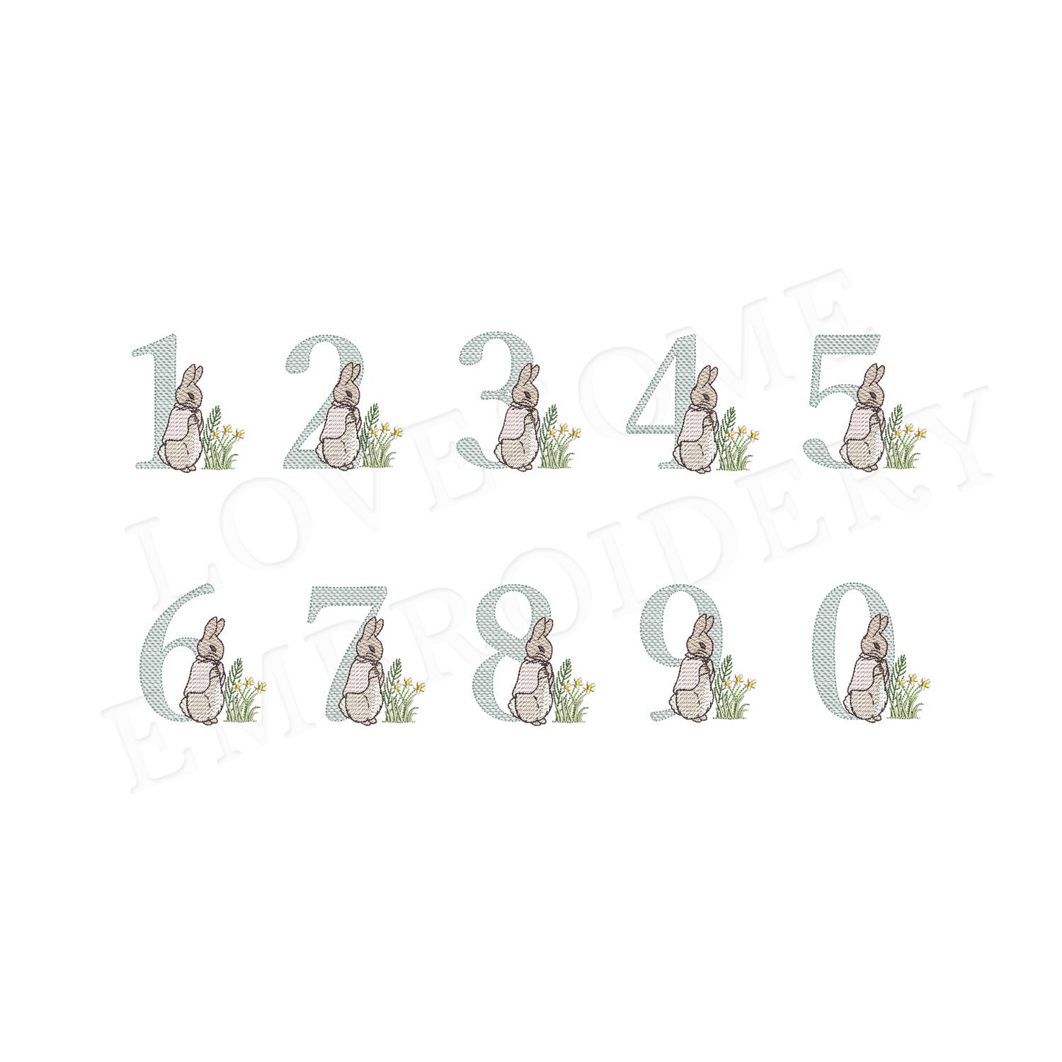 This listing features a machine embroidery numbers set which includes embroidery files of ten numbers (0-9) with Cottontail Rabbit design in 4inch size all in quick stitch (aka sketch fill) for 4x4 hoops for machine embroidery. (For the whole set, pls see the listing images.)