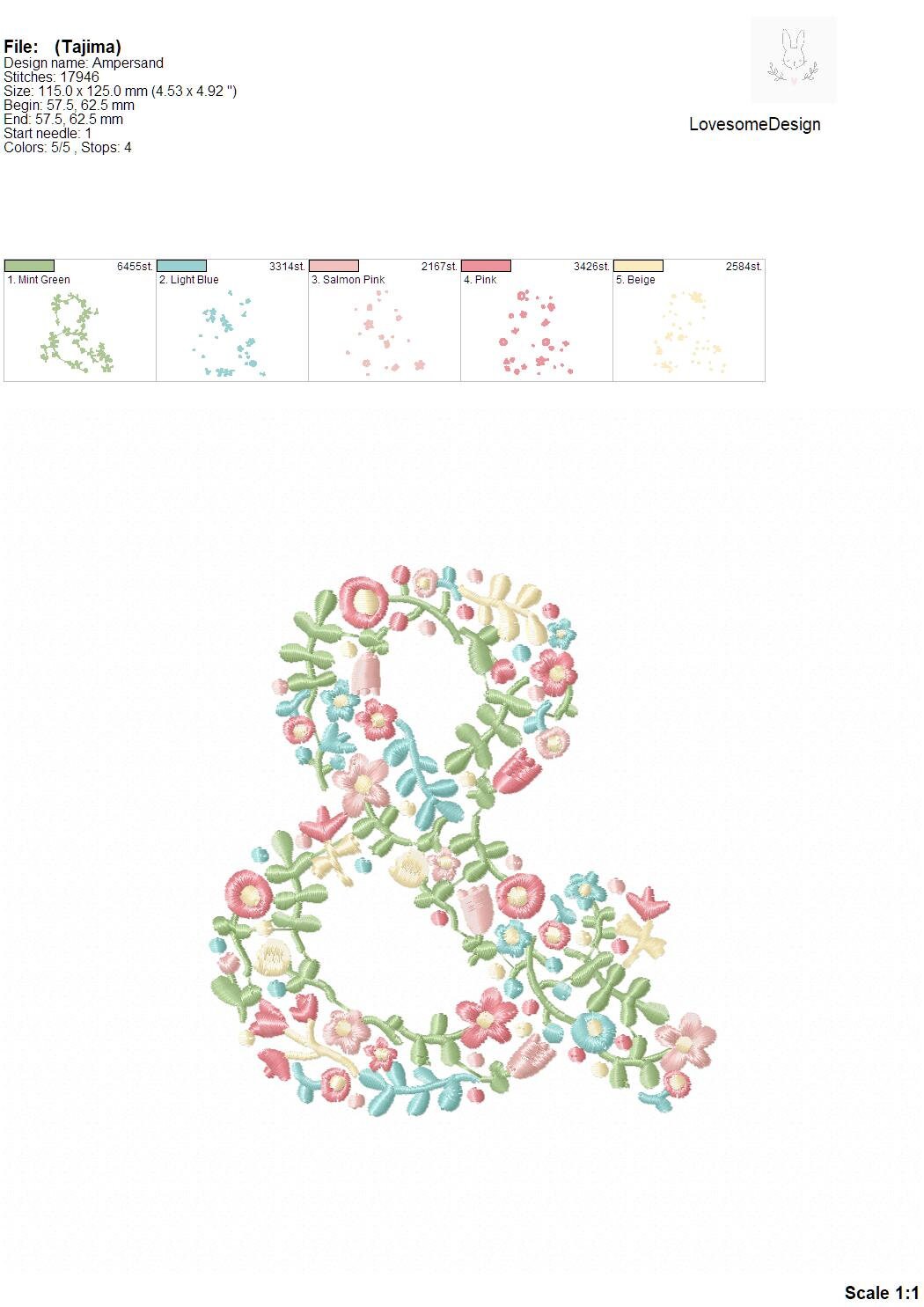 This listing features a machine embroidery file of floral fill ampersand in 5 inch size.