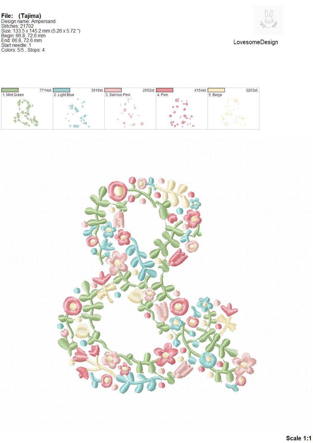 This listing features a machine embroidery file of floral fill ampersand in 6 inch size.