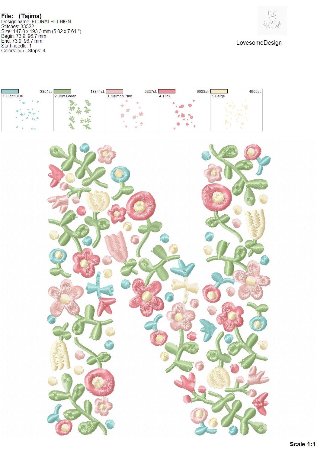 This listing features a machine embroidery file of one uppercase letter "N" which has a beautiful dainty floral fill design with pastel spring colors in 8inch size.