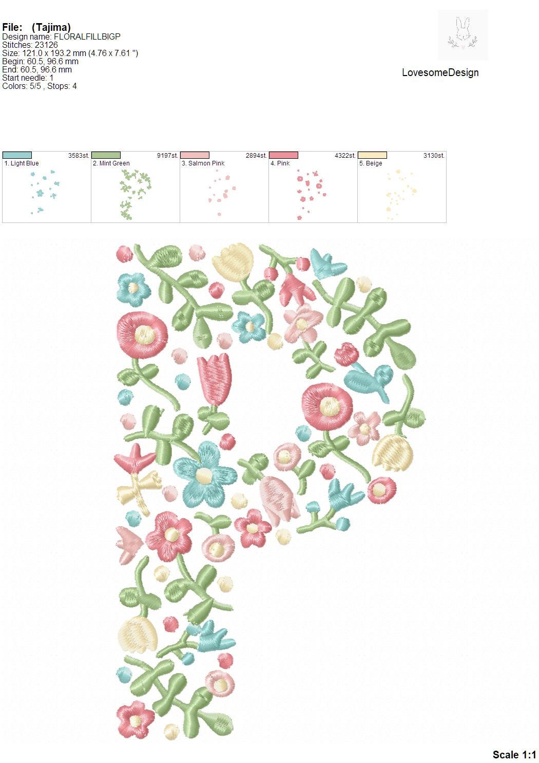 This listing features a machine embroidery file of one uppercase letter "P" which has a beautiful dainty floral fill design with pastel spring colors in 8inch size.