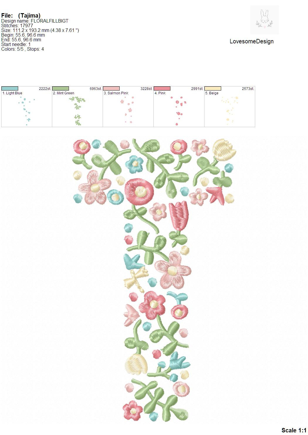 This listing features a machine embroidery file of one uppercase letter "T" which has a beautiful dainty floral fill design with pastel spring colors in 8inch size.