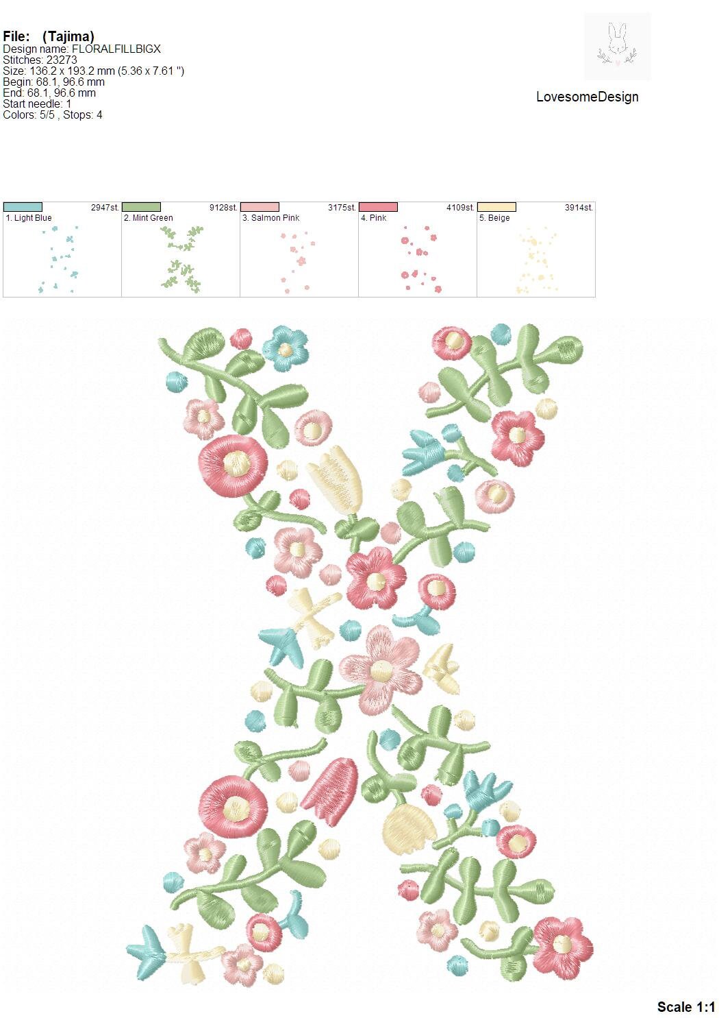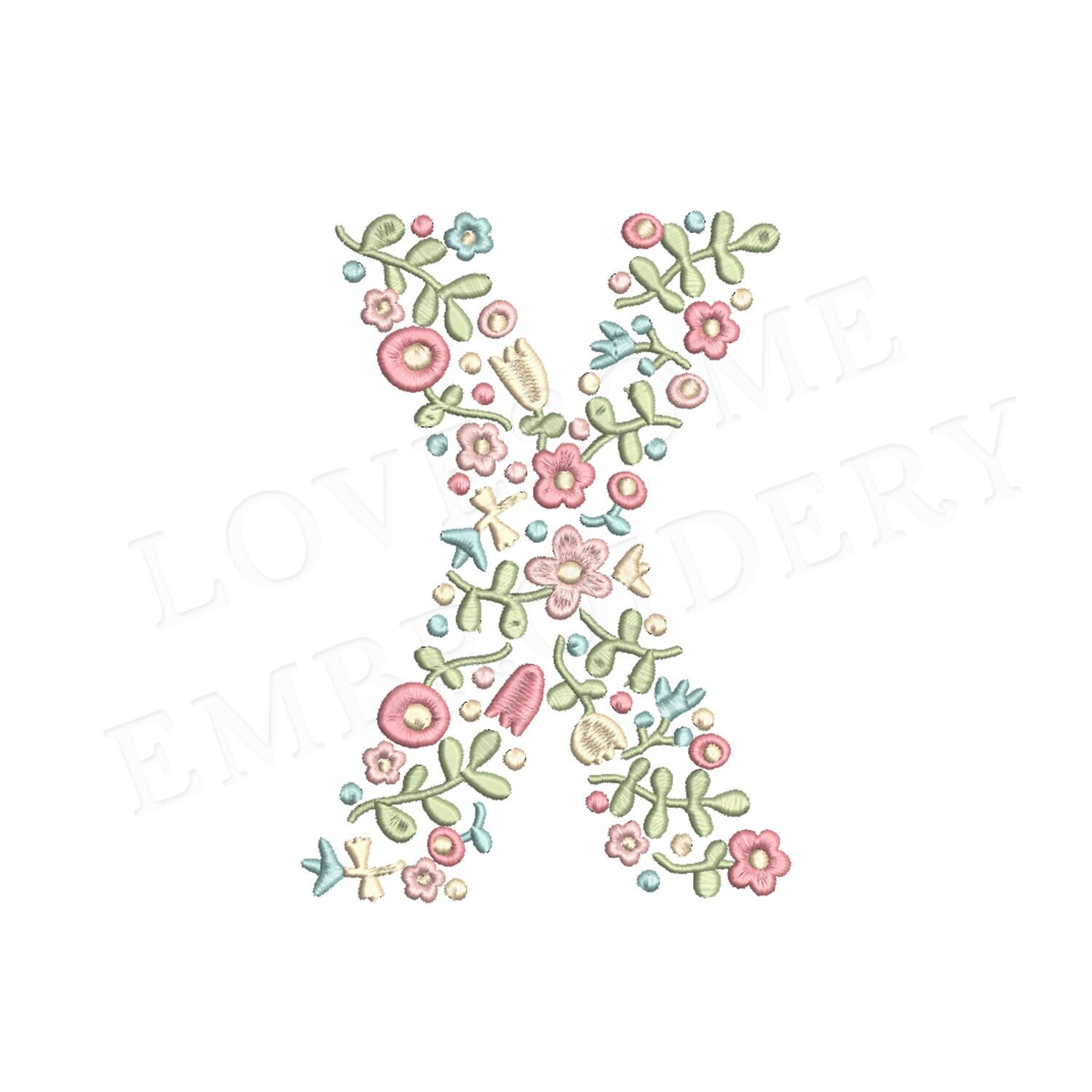This listing features a machine embroidery file of one uppercase letter "X" which has a beautiful dainty floral fill design with pastel spring colors in 8inch size.
