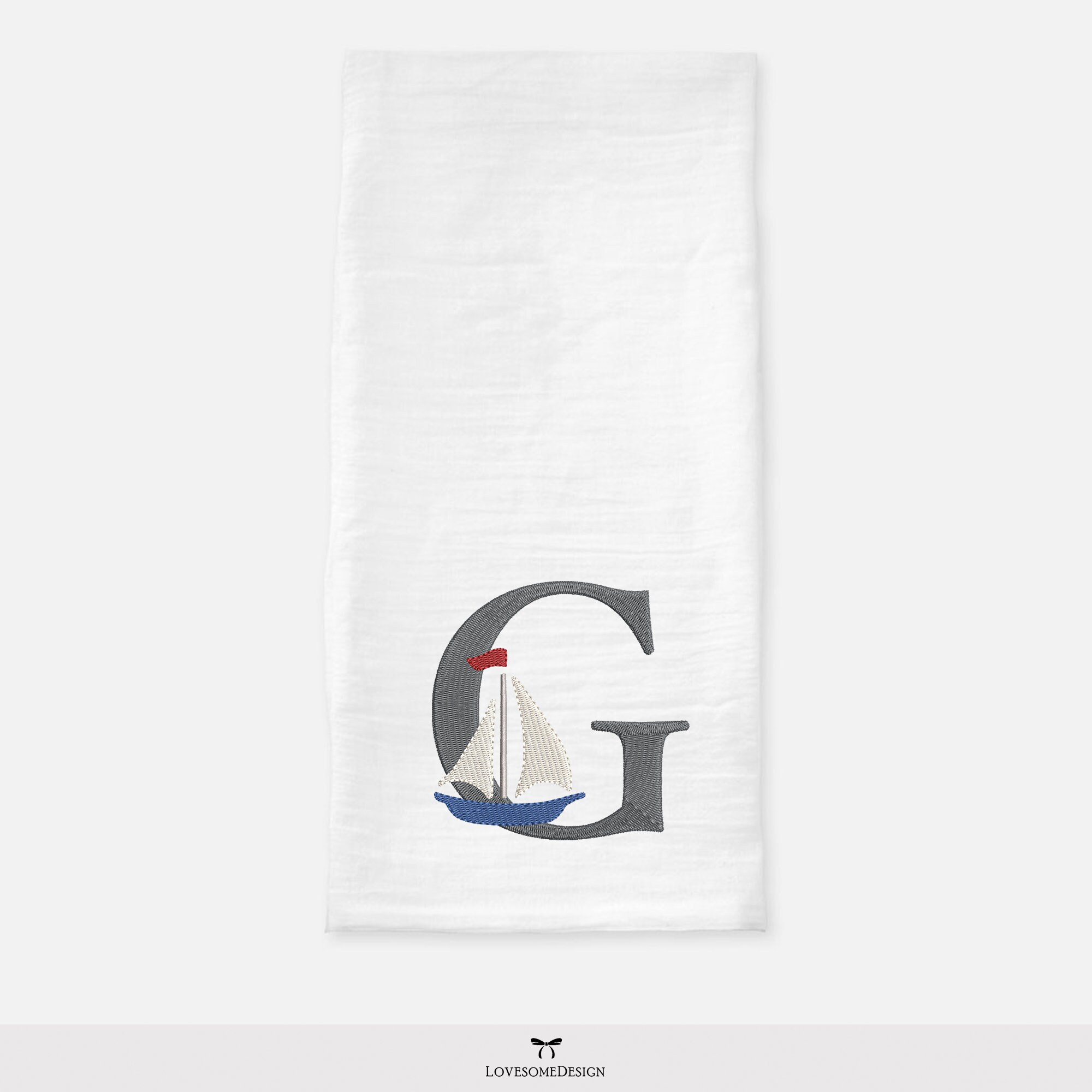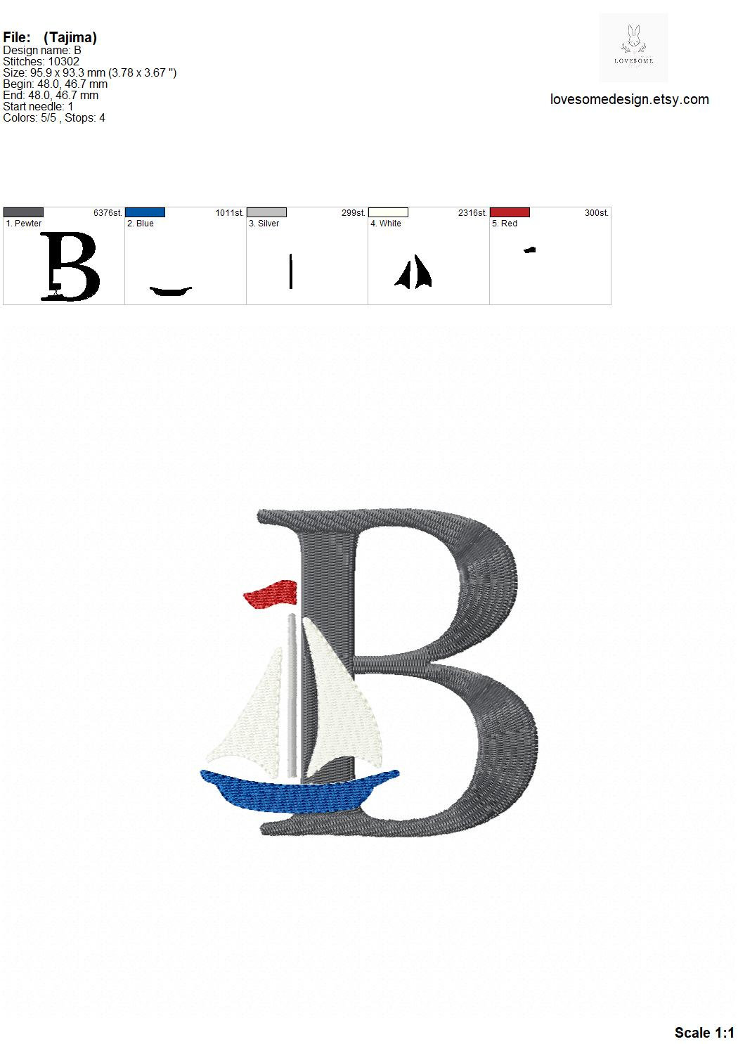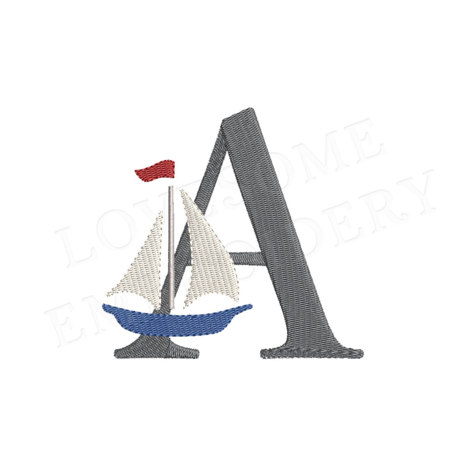 This listing features a machine embroidery font set which includes embroidery files of 26 uppercase nautical embroidery letters with a stylish sailboat design in 4inch size. (For the whole set, pls see the listing images.)
