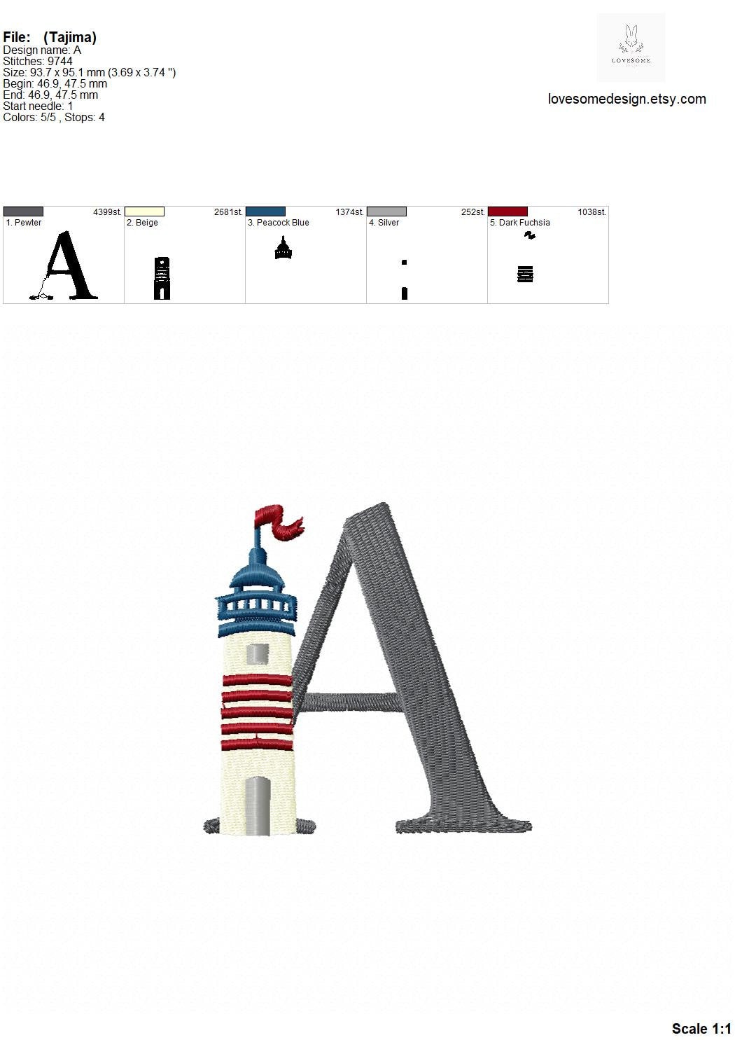 This listing features a machine embroidery font set which includes embroidery files of 26 uppercase nautical embroidery letters with a stylish lighthouse design in 4inch size. (For the whole set, pls see the listing images.)