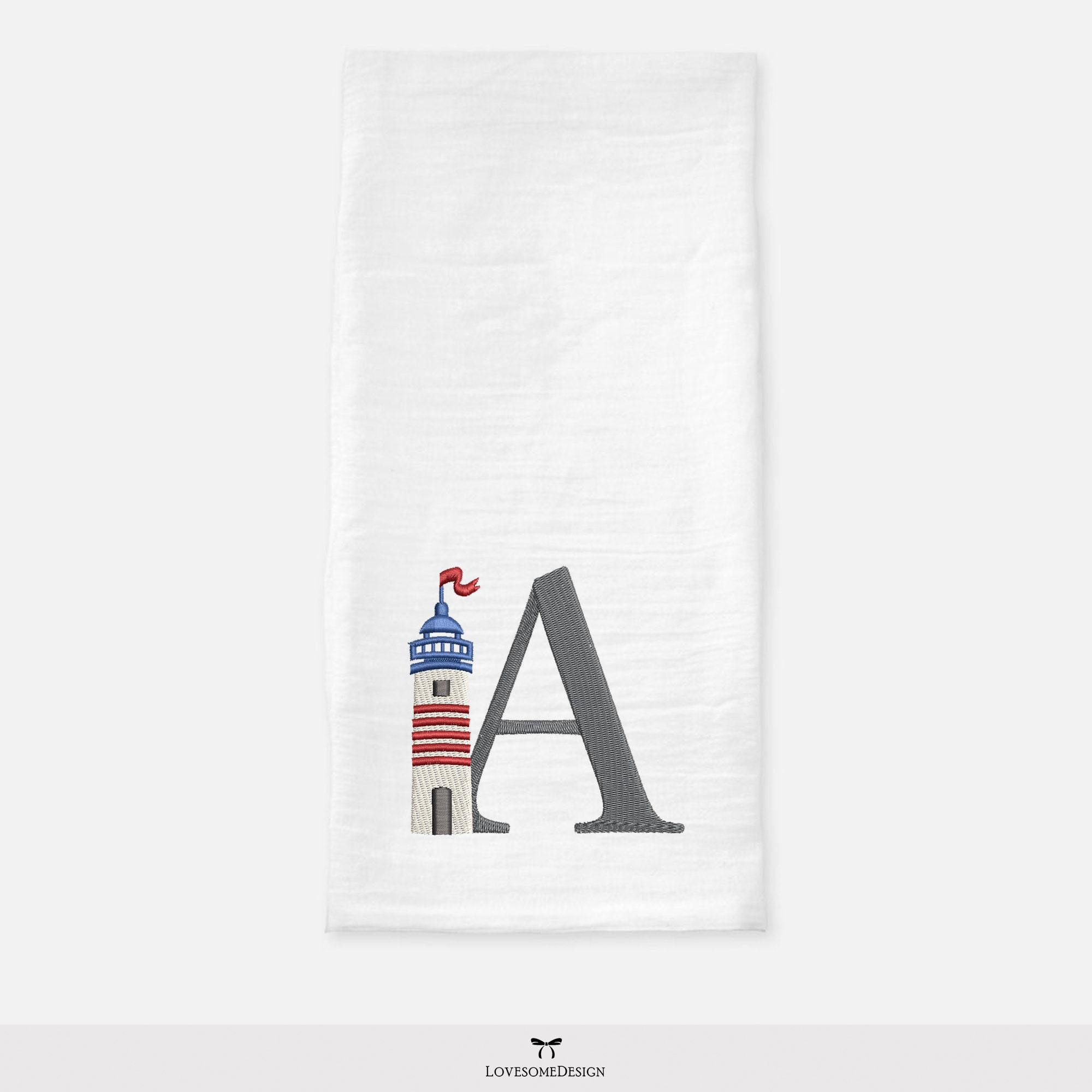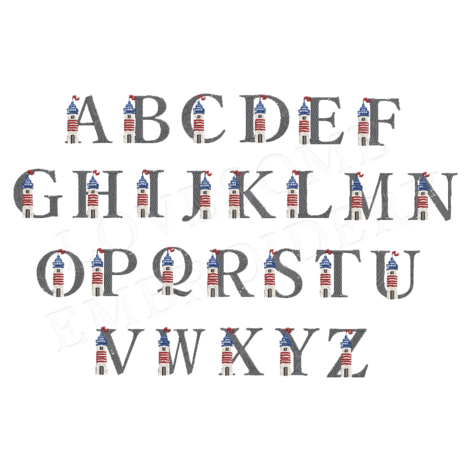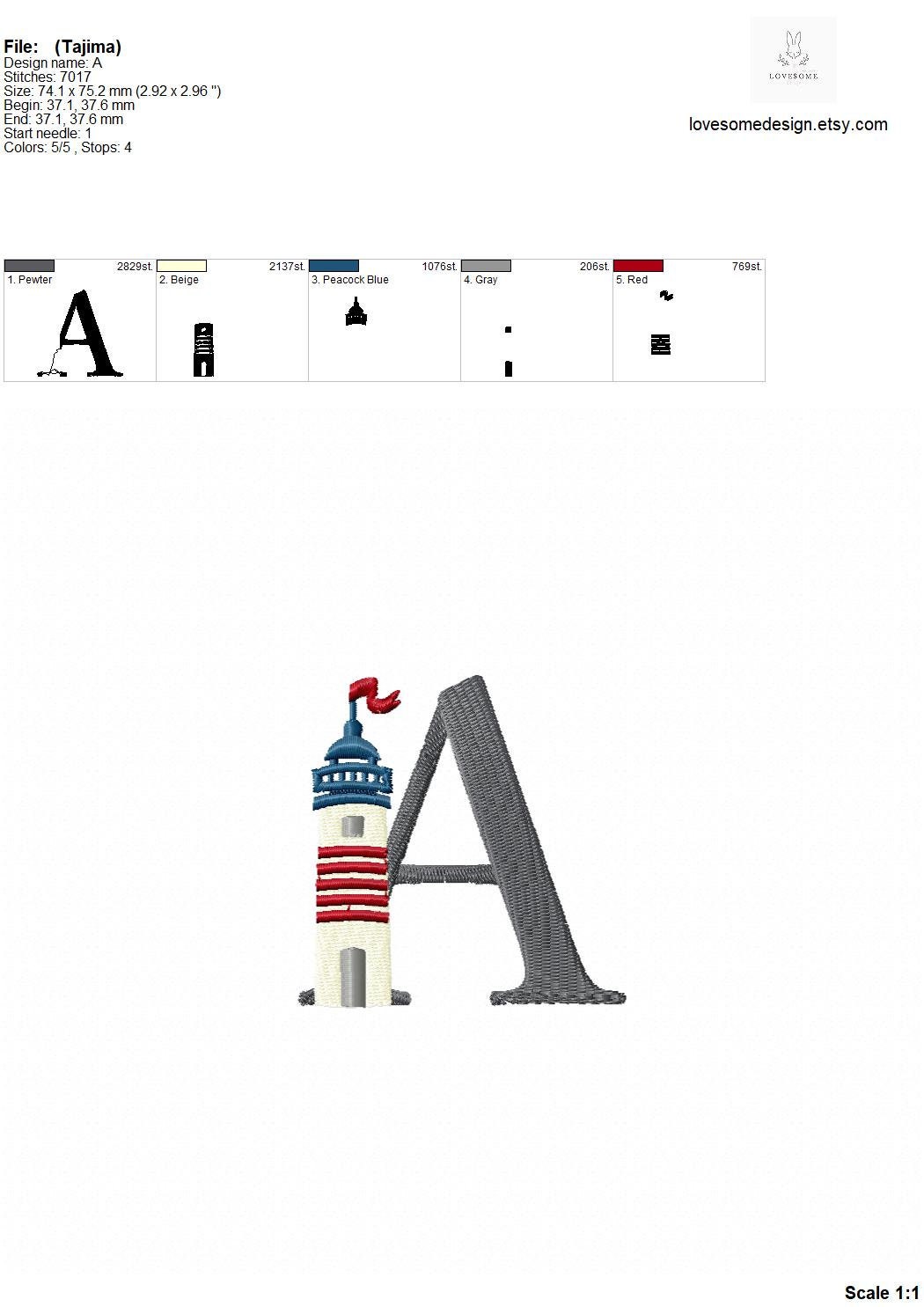 This listing features a machine embroidery font set which includes embroidery files of 26 uppercase nautical embroidery letters with a stylish lighthouse design in 3inch size. (For the whole set, pls see the listing images.)