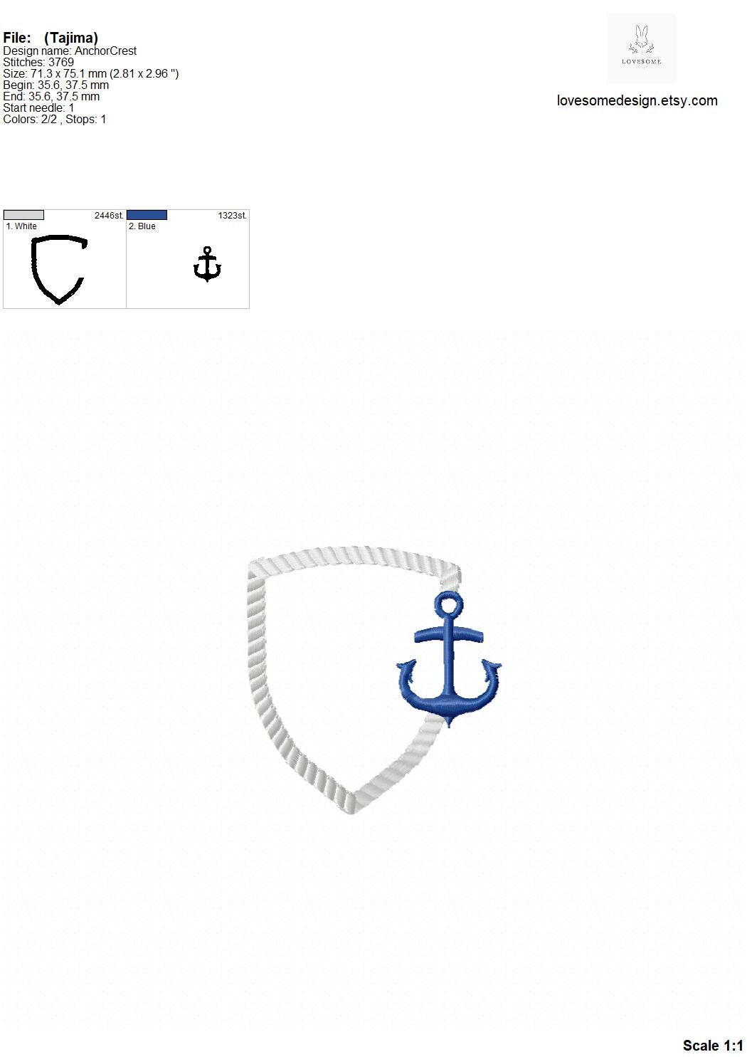 This listing includes one crest design in rope stitch with an anchor for machine embroidery in one size, each appr. in 3inch size.