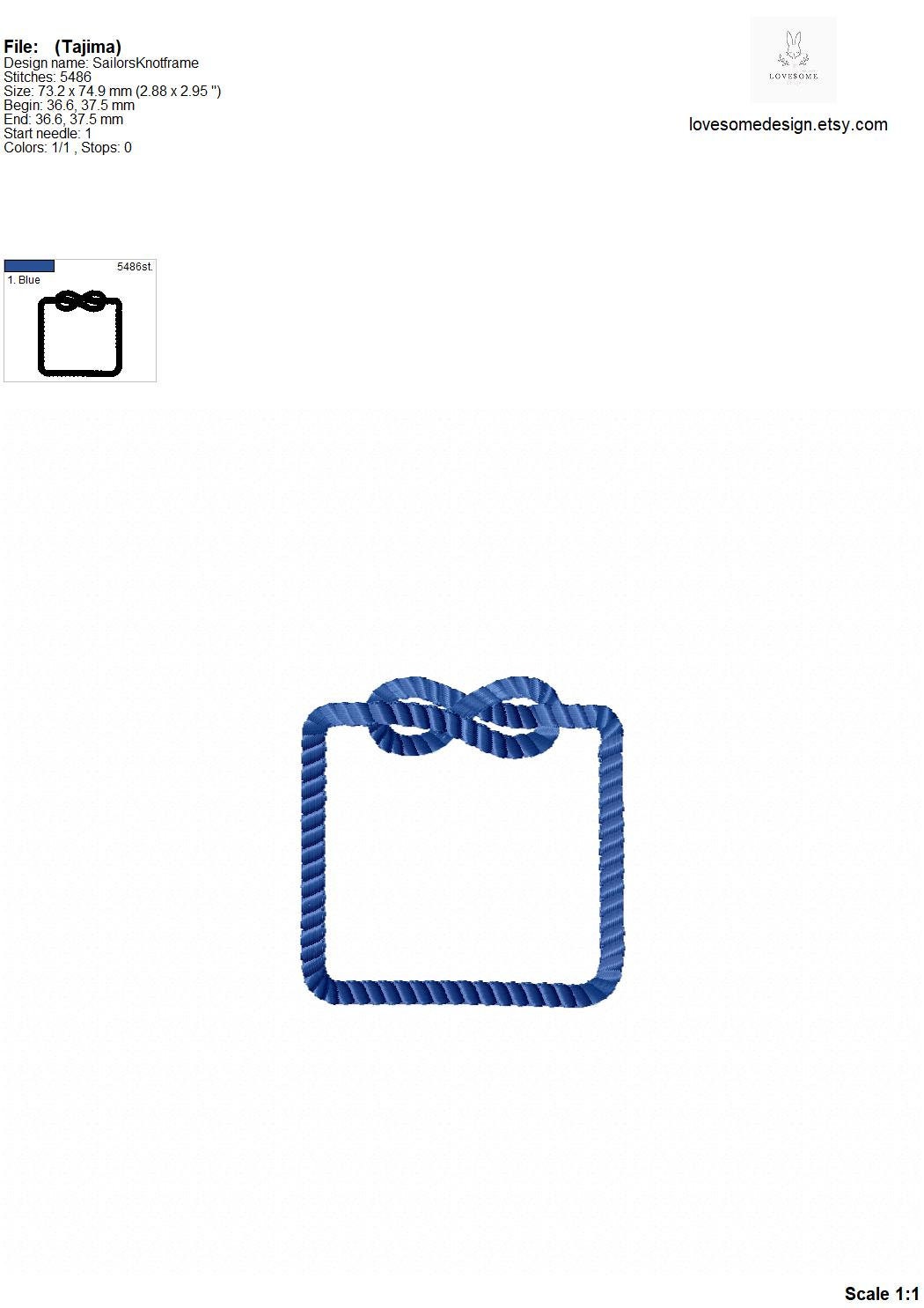 This listing includes one frame design in rope stitch with a sailors knot for machine embroidery in one size, each appr. in 3inch size.