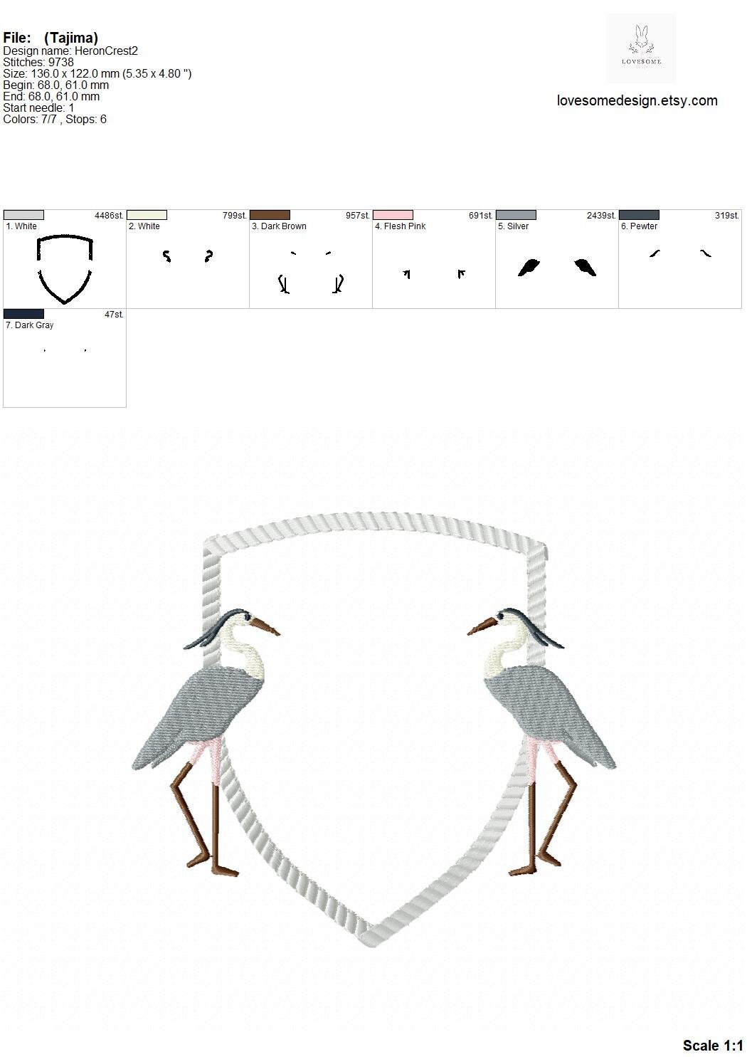 This listing includes one crest design in rope stitch with a pair of stylish crane birds for machine embroidery in one size, each appr. in 5inch size.