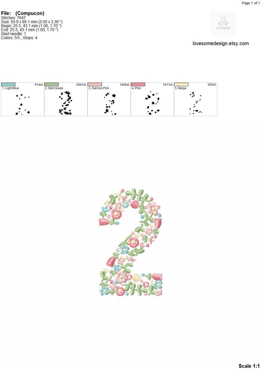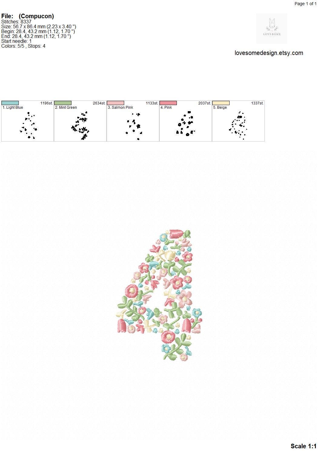 This listing features a machine embroidery font set which includes embroidery files of 10 dainty floral fill numbers 0-9 with pastel spring colors in 3.5inch size. For the whole set, pls see the listing images.