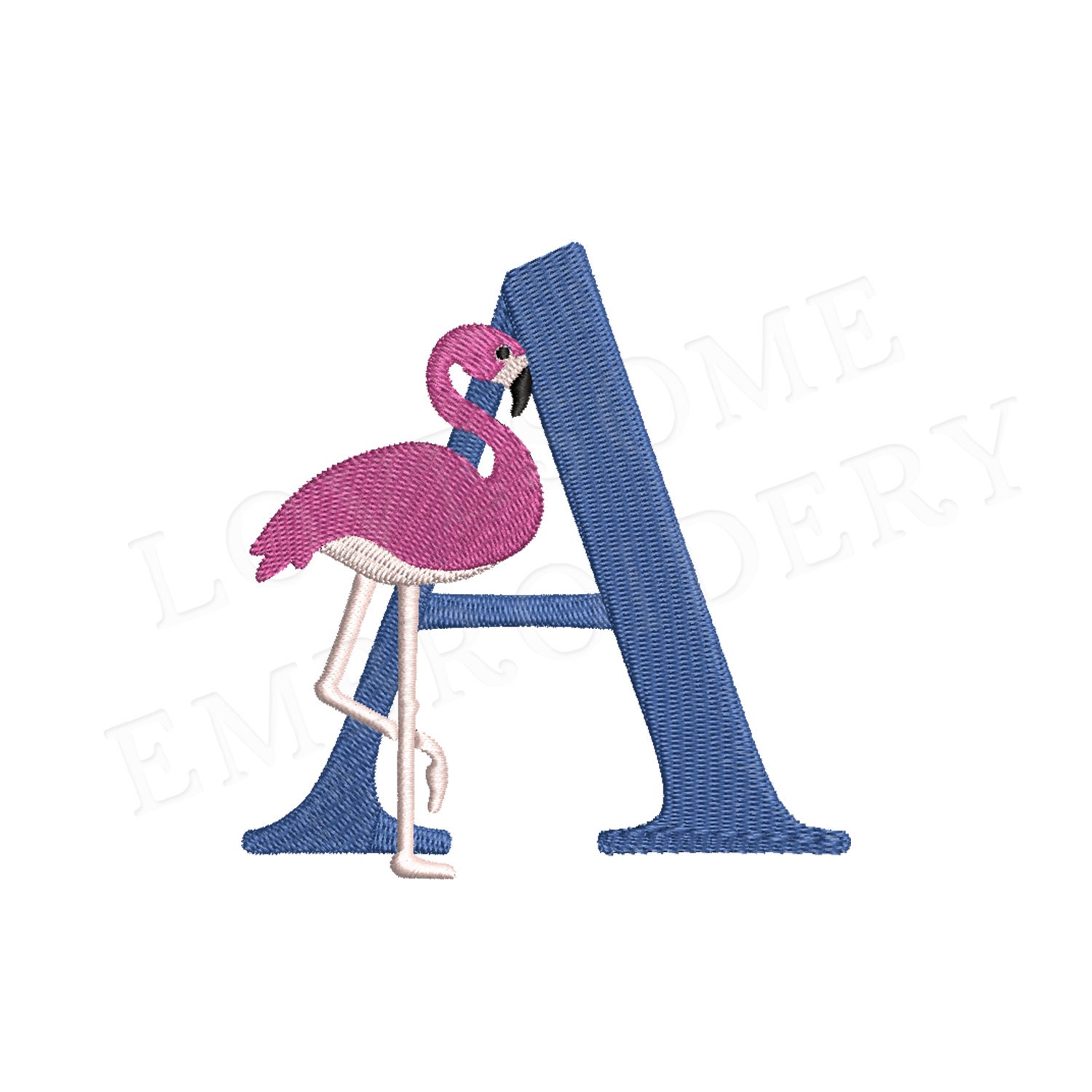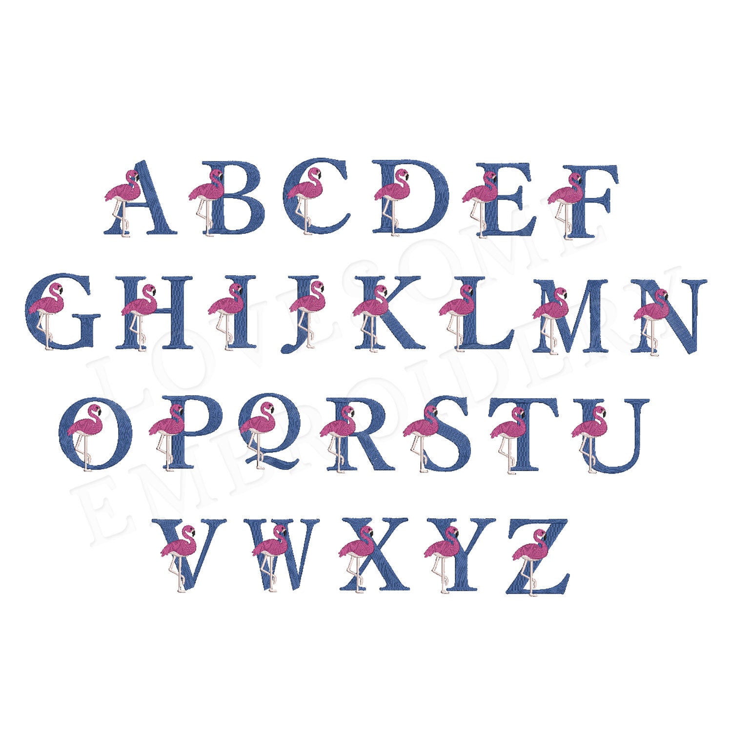 This listing features a machine embroidery font set which includes embroidery files of 26 uppercase tropical embroidery letters with a stylish flamingo design in 3inch size. (For the whole set, pls see the listing images.)