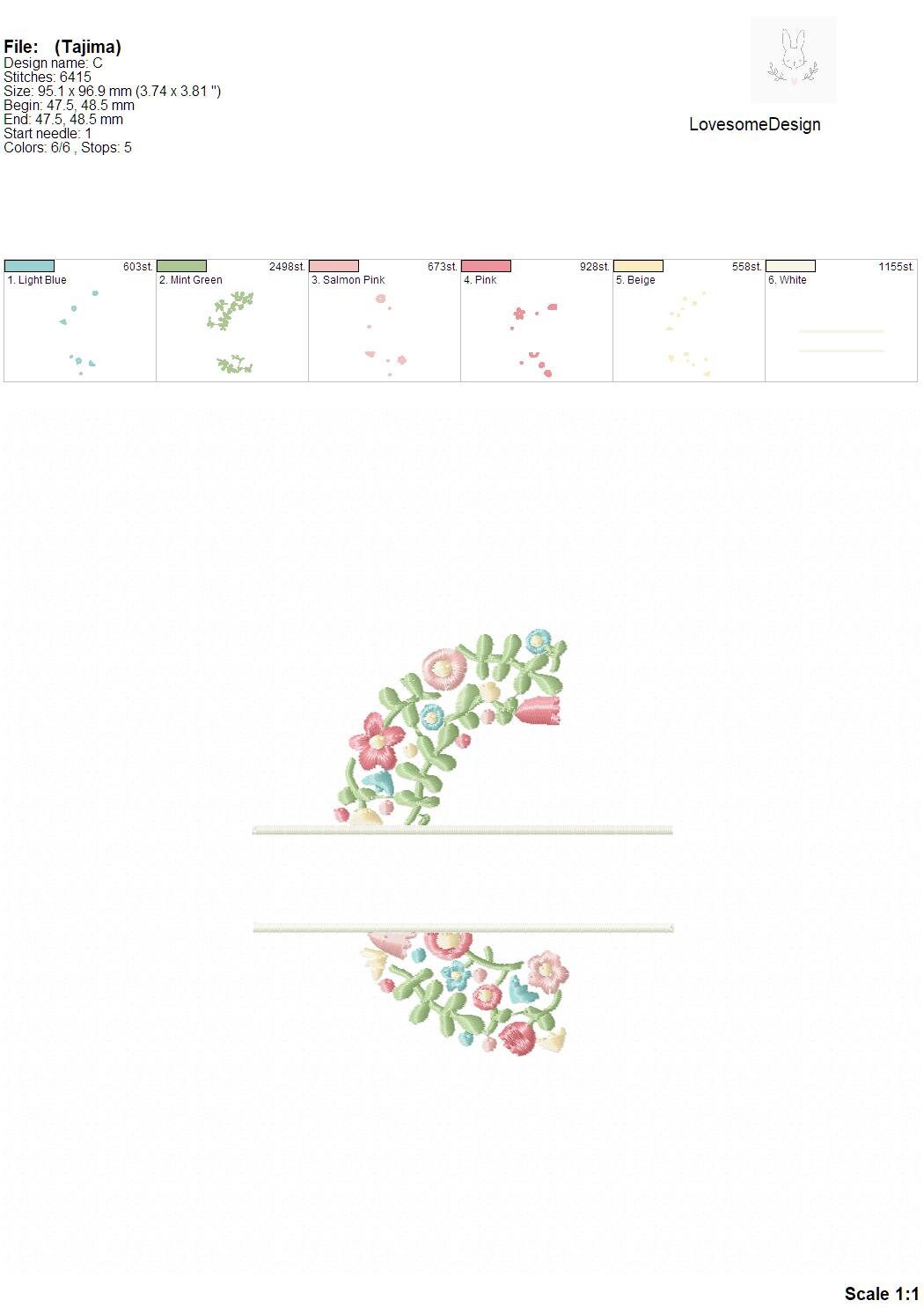 NEW Split Floral Letter C 4inch Machine Embroidery Design Dainty Flowers Split Font in Spring Colors Digital Download | Lovesome Design