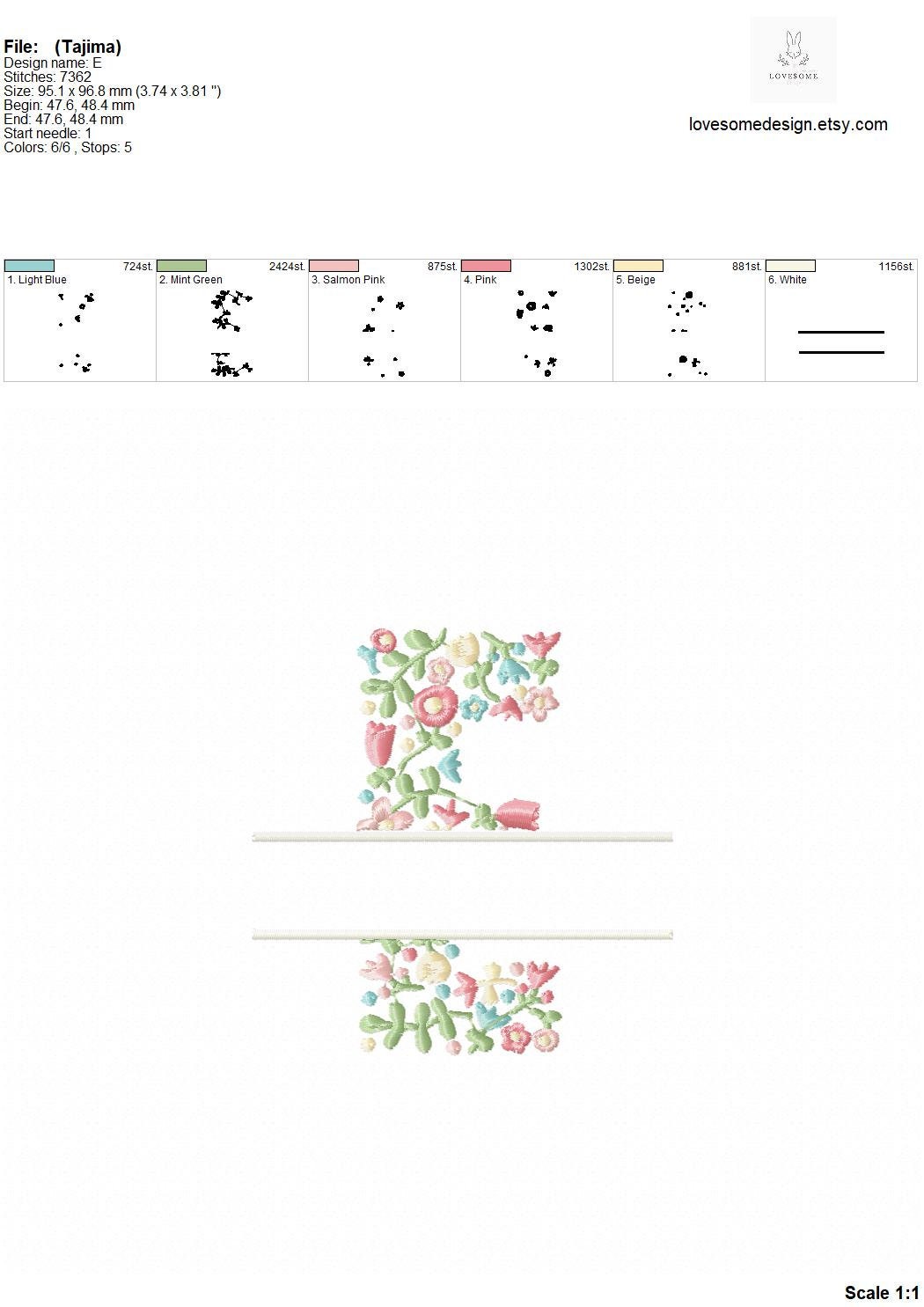 This listing features a machine embroidery file of one uppercase split letter "E" which has a beautiful dainty floral fill design with pastel spring colors in 4inch size.