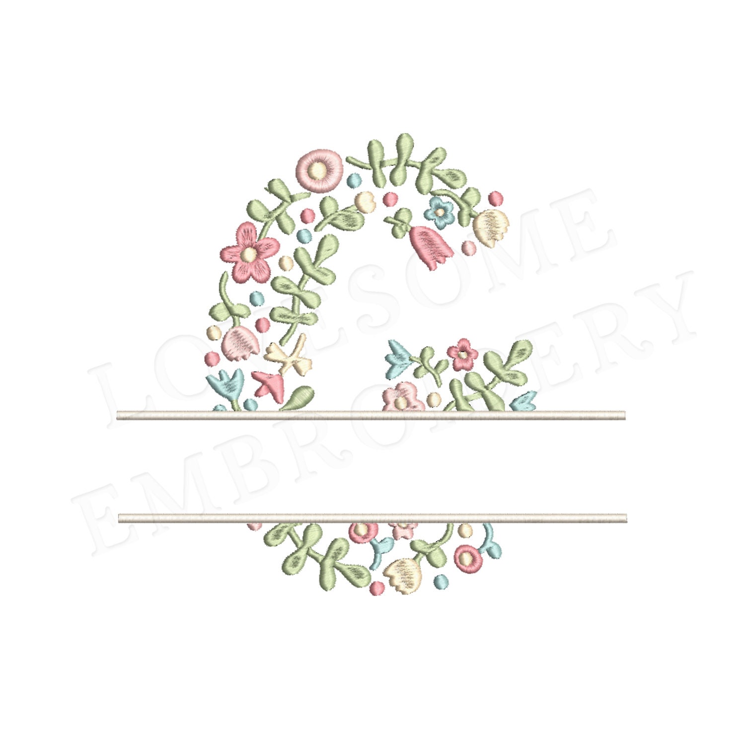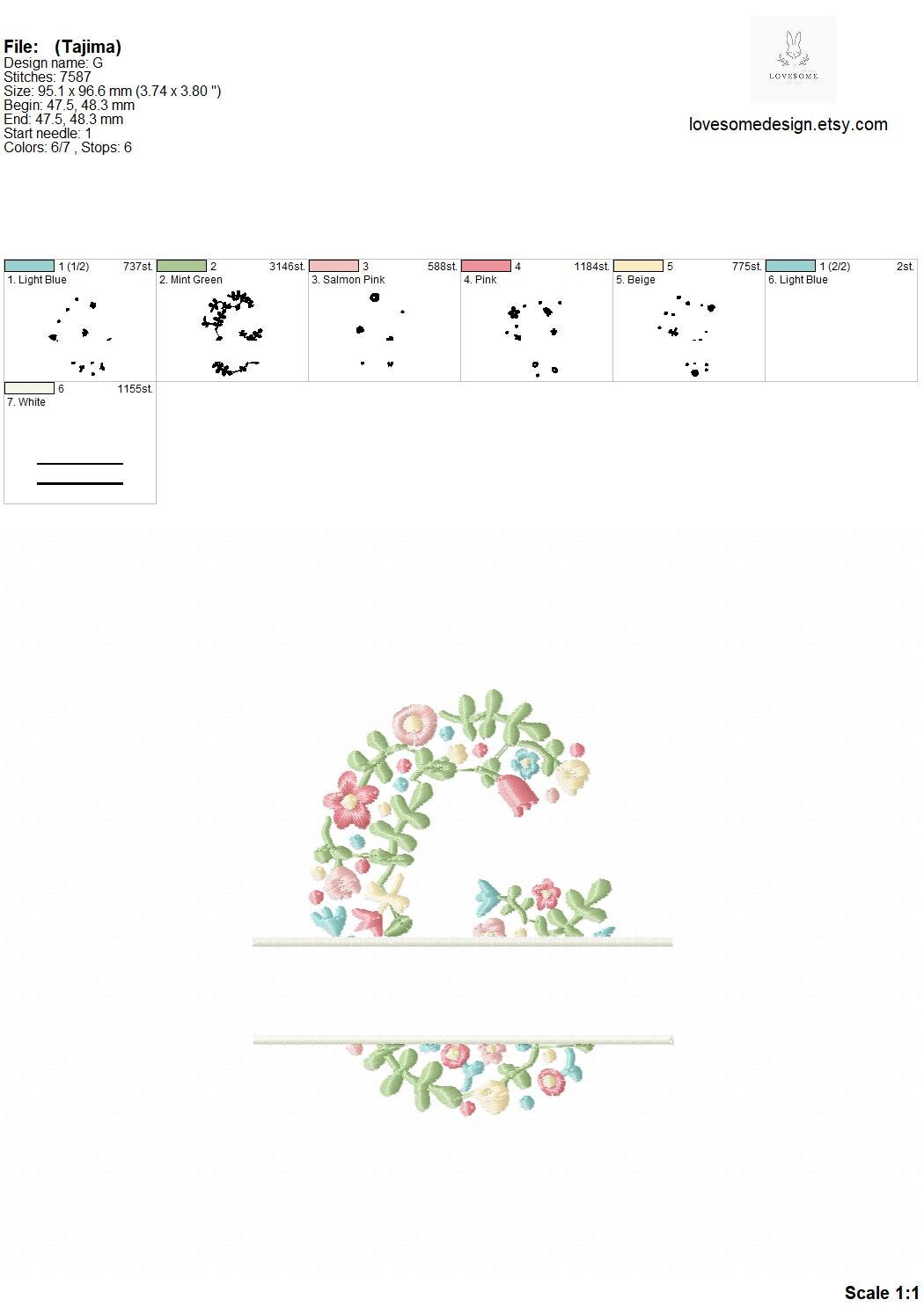 This listing features a machine embroidery file of one uppercase split letter "G" which has a beautiful dainty floral fill design with pastel spring colors in 4inch size.