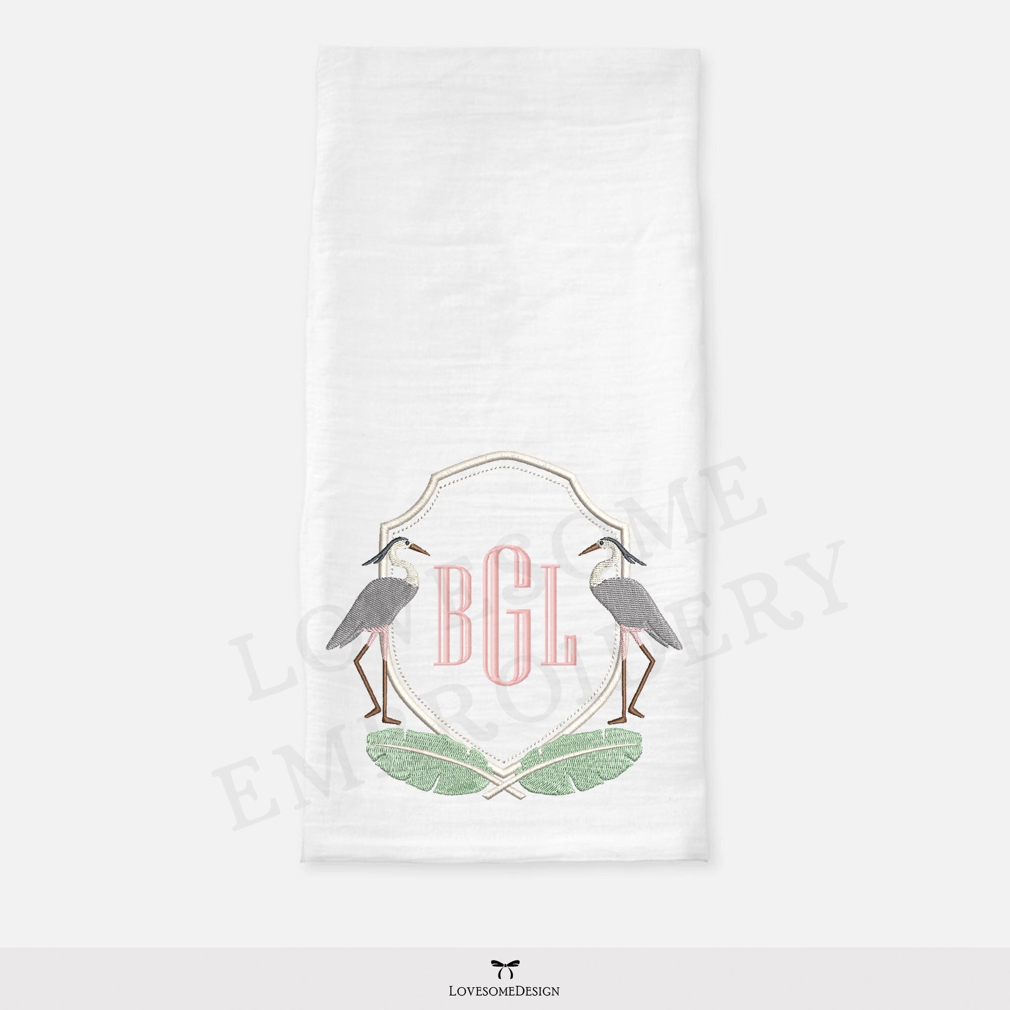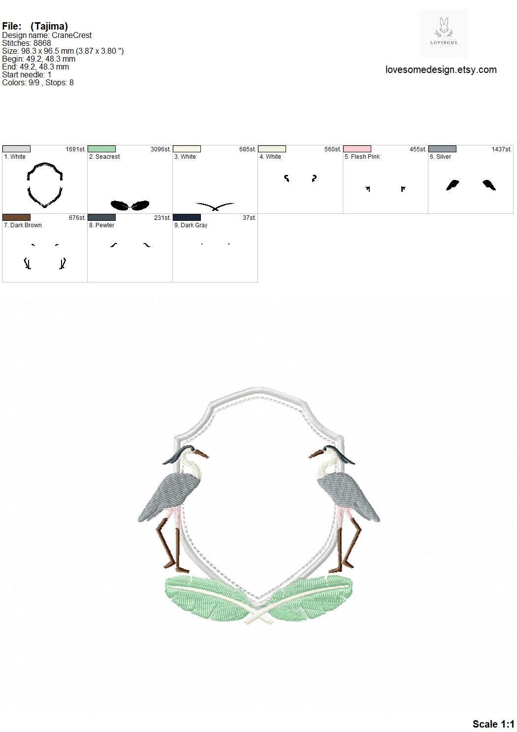 This listing includes one crest design with a pair of stylish crane birds and tropical leaves for machine embroidery in one size, each appr. in 4inch size.