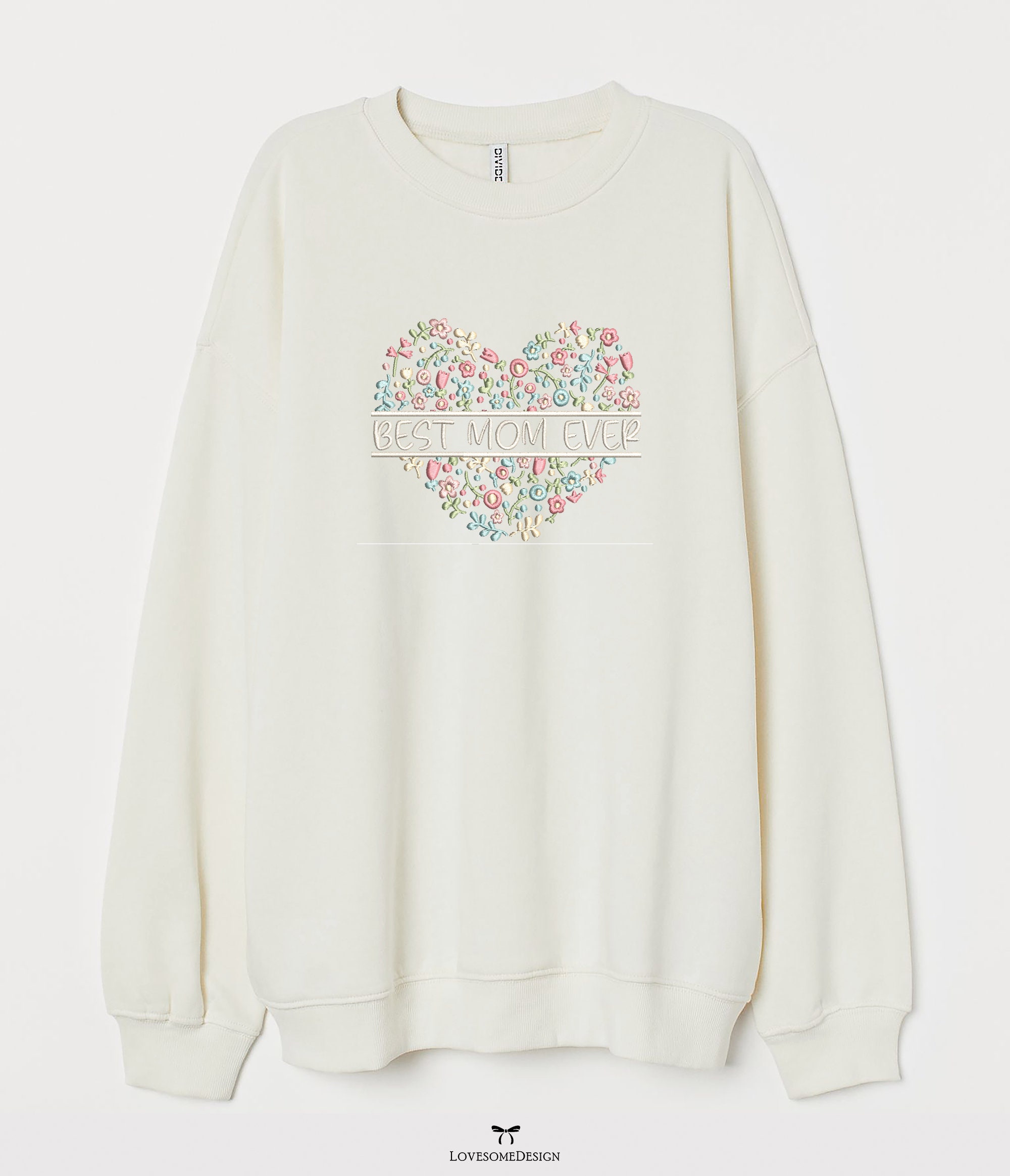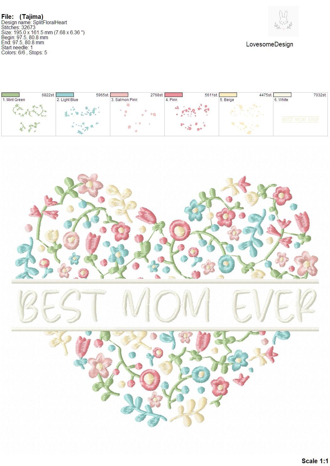 This listing features a machine embroidery file of floral fill split heart with a lettering "Best Mom Ever" in 8 inch size.
