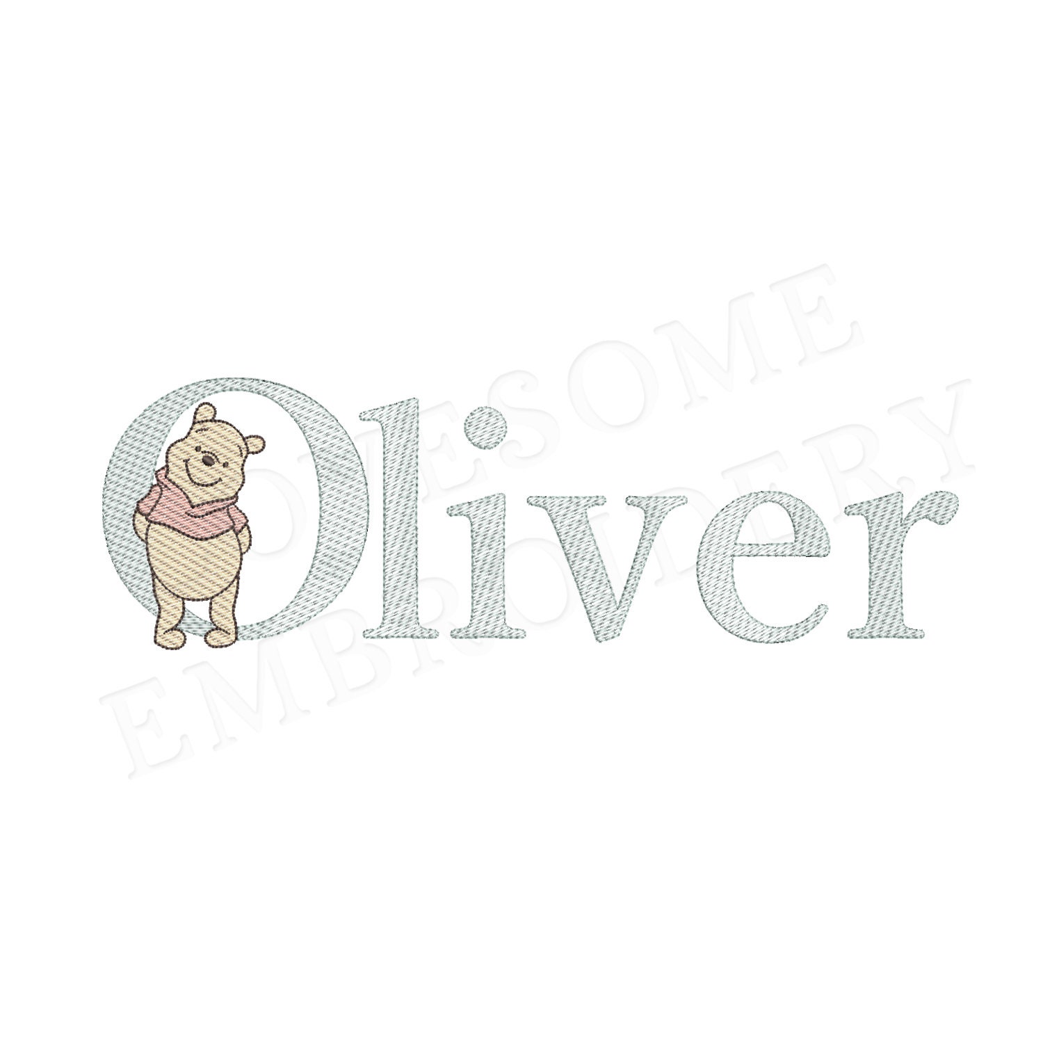 This listing features a machine embroidery font set which includes embroidery files of 26 uppercase monogram letters with quick stitch (light fill or sketch fill) Winnie the Pooh design in 3inch size. (For the whole set, pls see the listing images.)