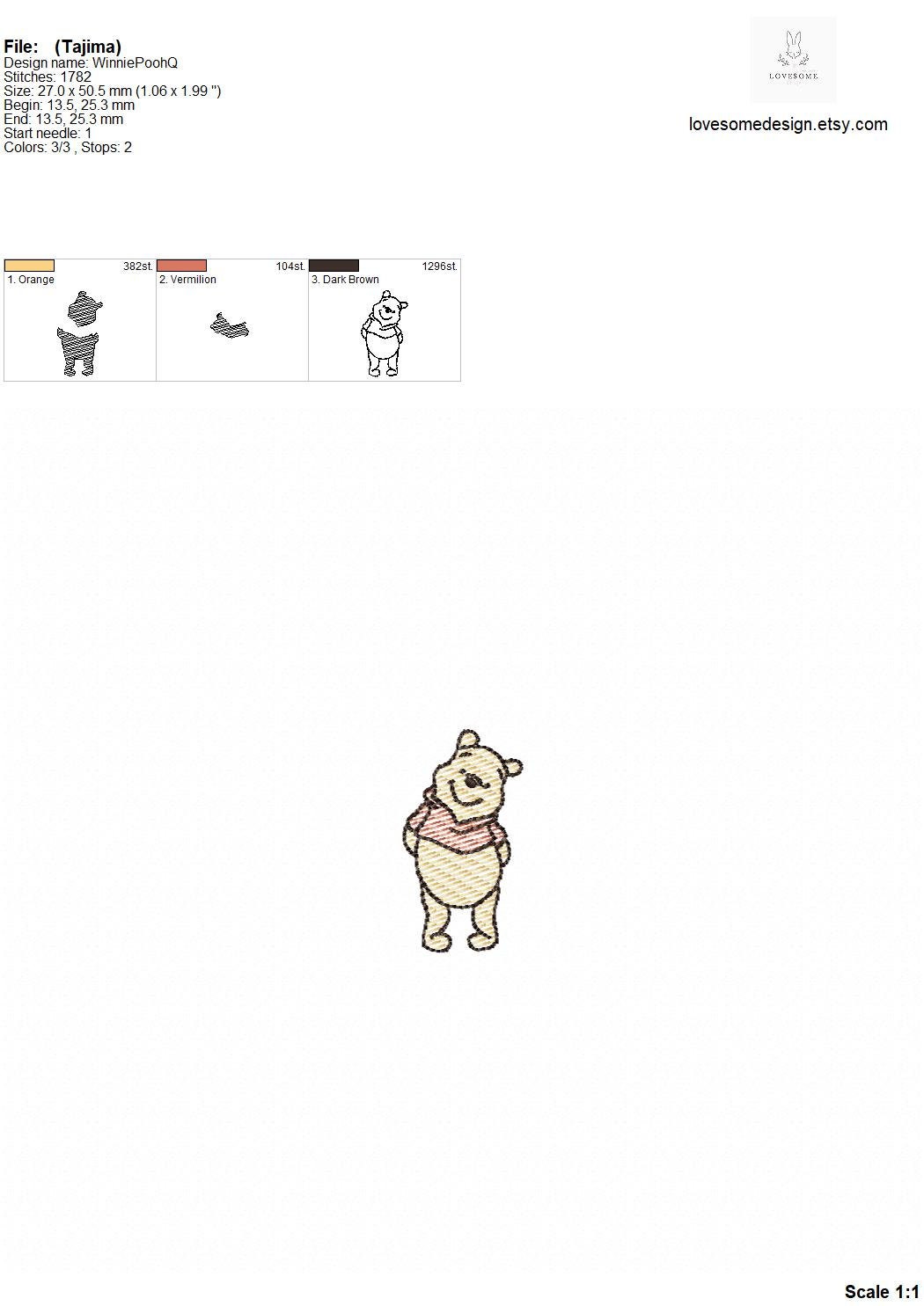 This listing features a machine embroidery file of quick stitch (aka sketch fill or light fill) mini Winnie the Pooh design in 2 inch size.