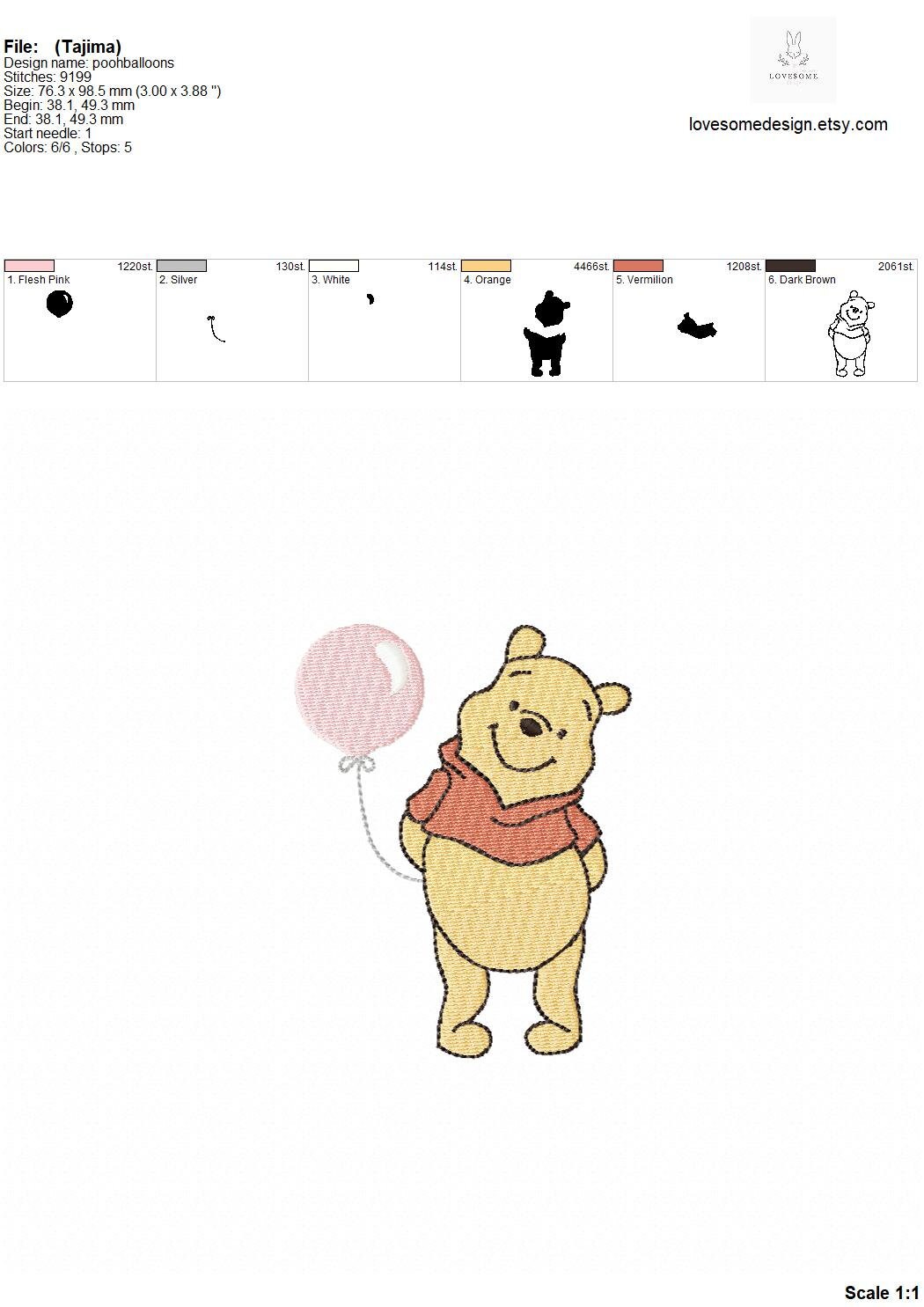 This listing features a machine embroidery file of Winnie the Pooh design with a cute balloon in 4 inch size.
