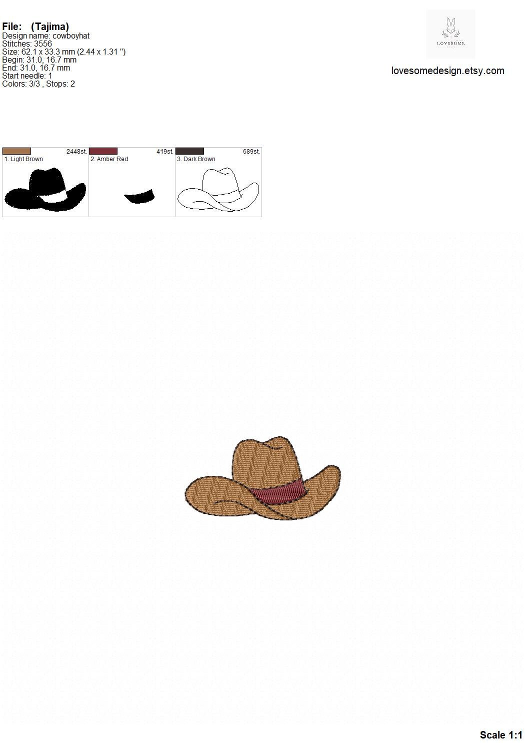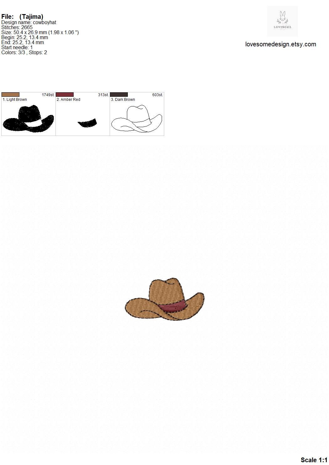 This listing includes cowboy hat for machine embroidery in three sizes, each appr. in 2.5inch, 2inch and 1.5inch size.