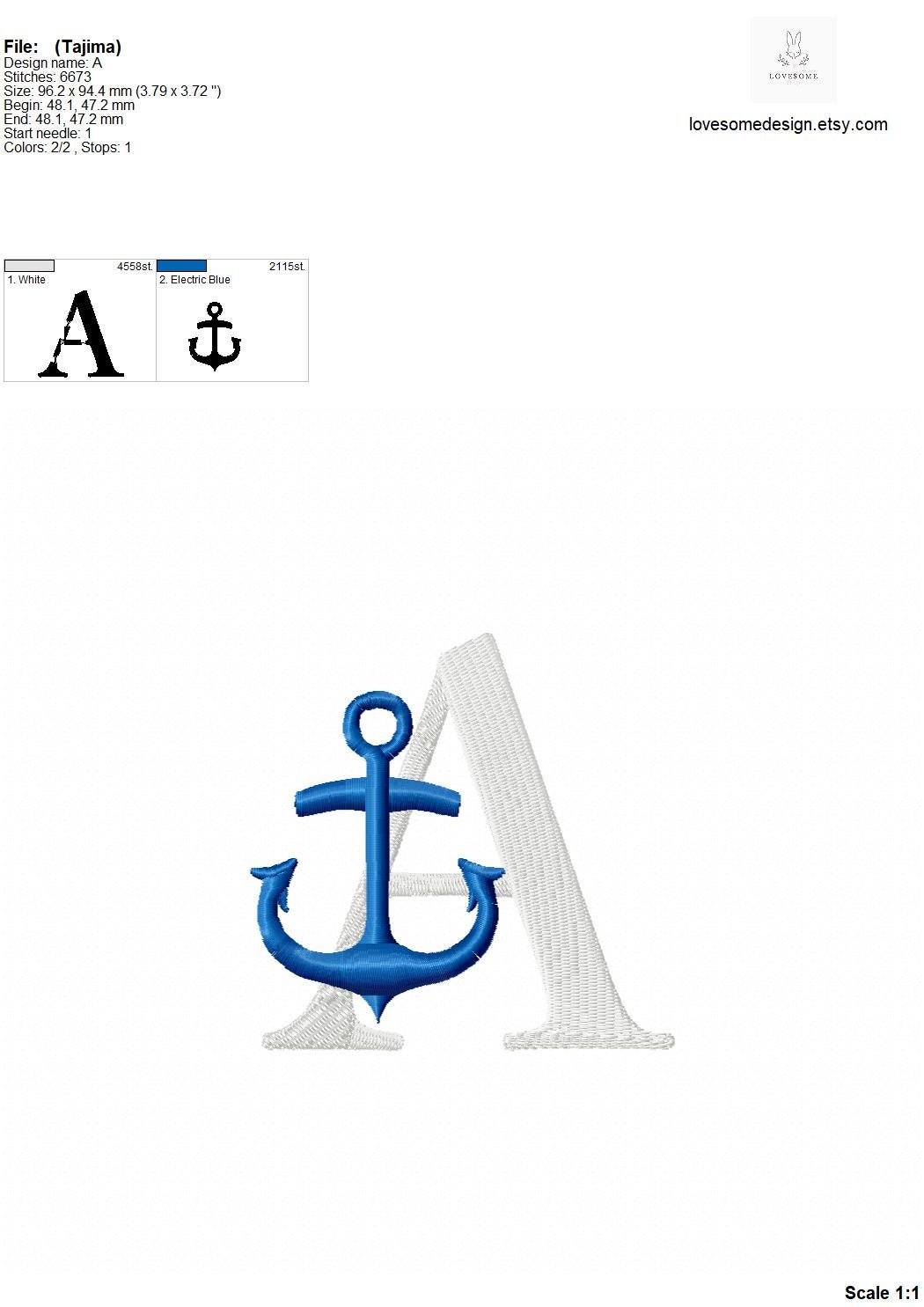 This listing features a machine embroidery font set which includes embroidery files of 26 uppercase nautical embroidery letters with a stylish anchor design in 4inch size. (For the whole set, pls see the listing images.)
