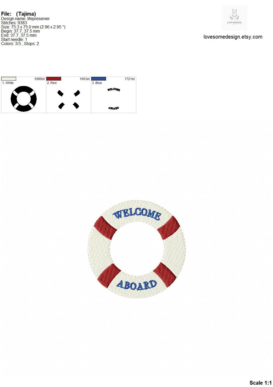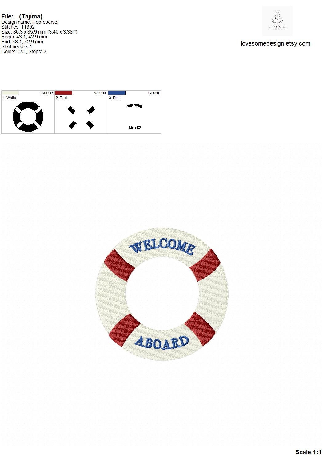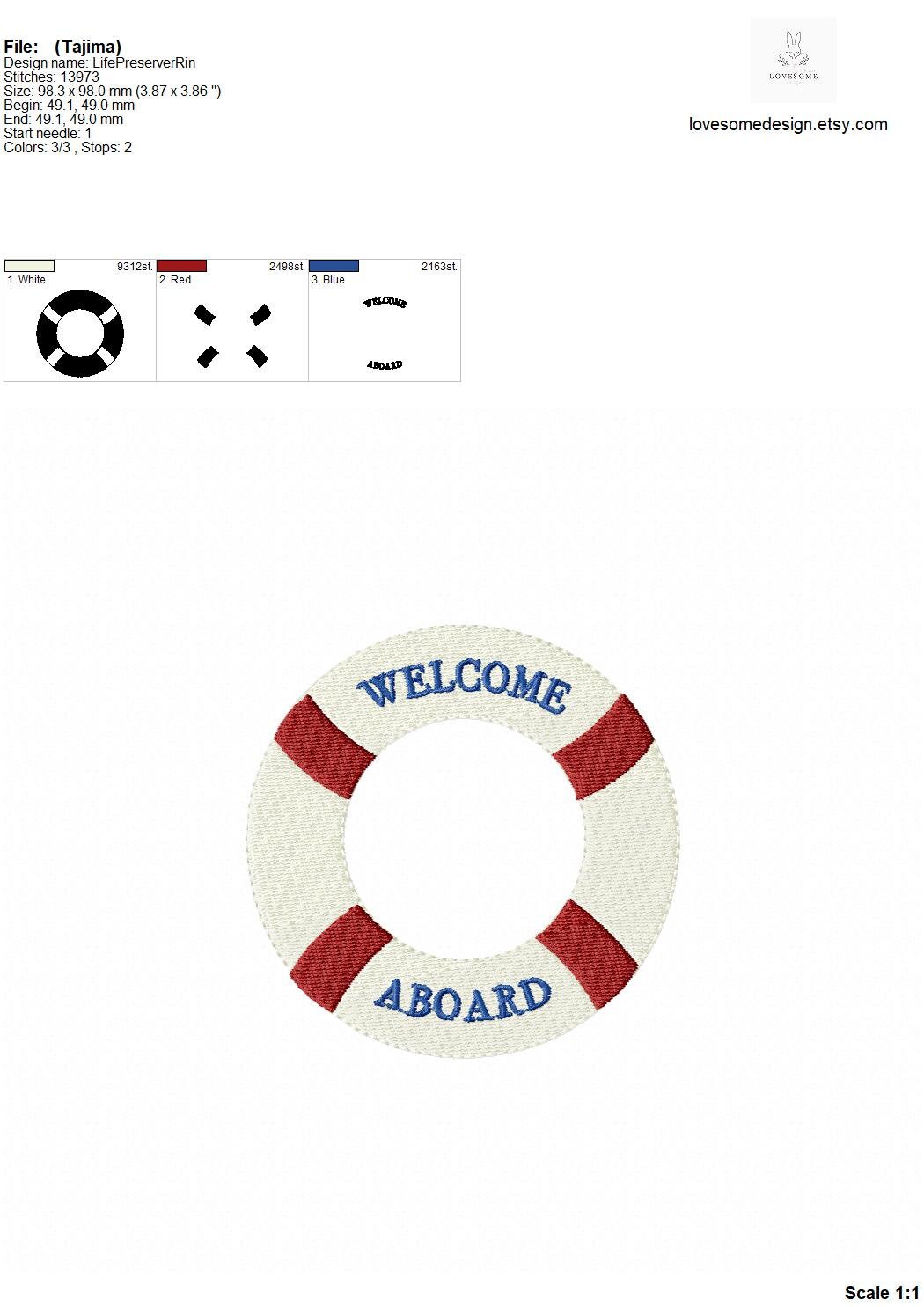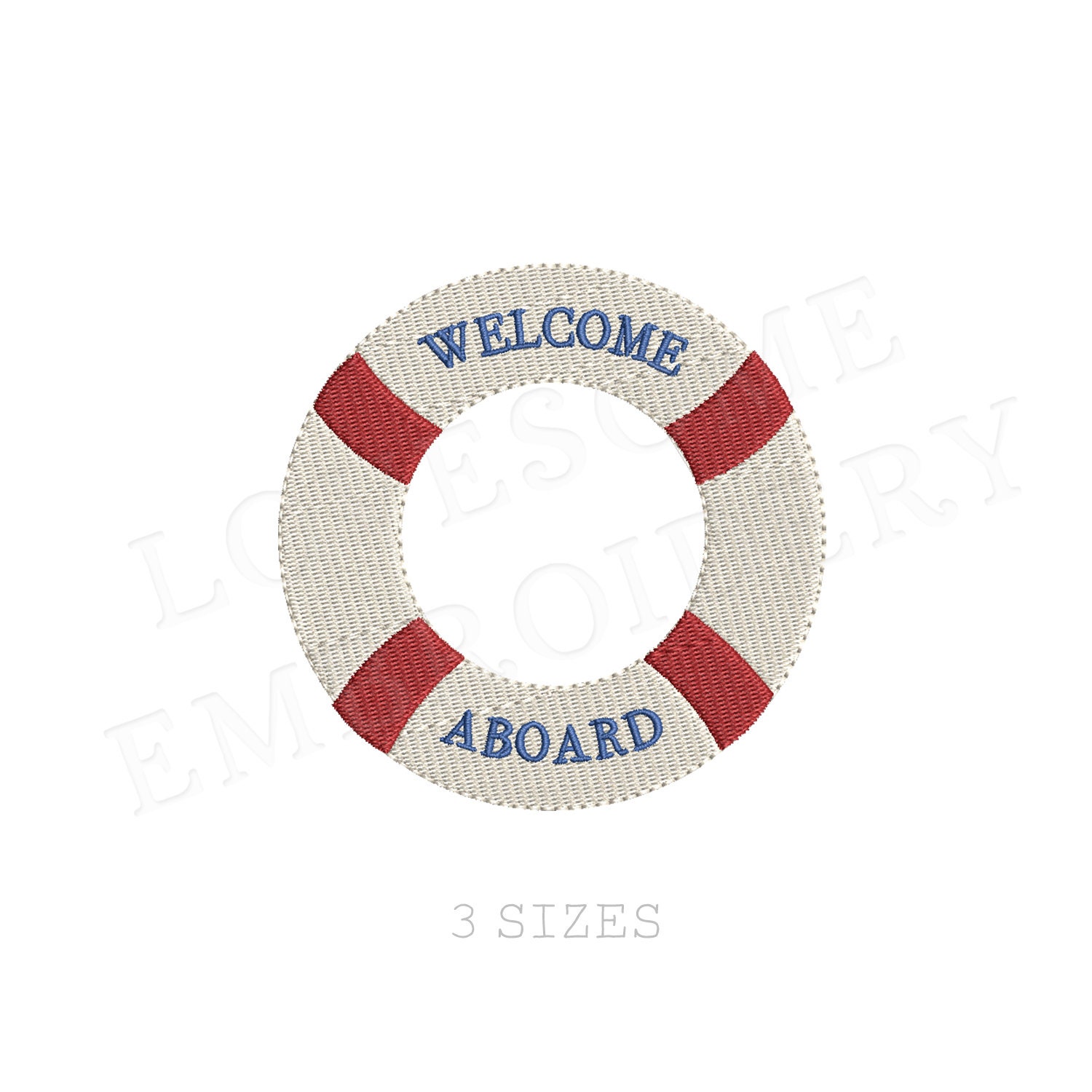 This listing includes one life buoy with a lettering "Welcome Aboard" design for machine embroidery in three sizes, 4inch, 3.5inch and 3inch for embroidery hoops 4x4 and bigger.
