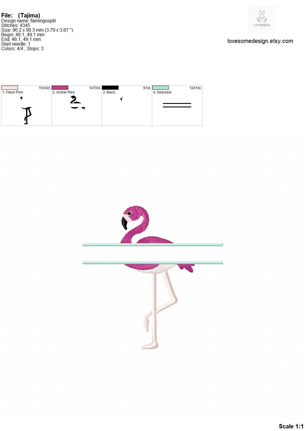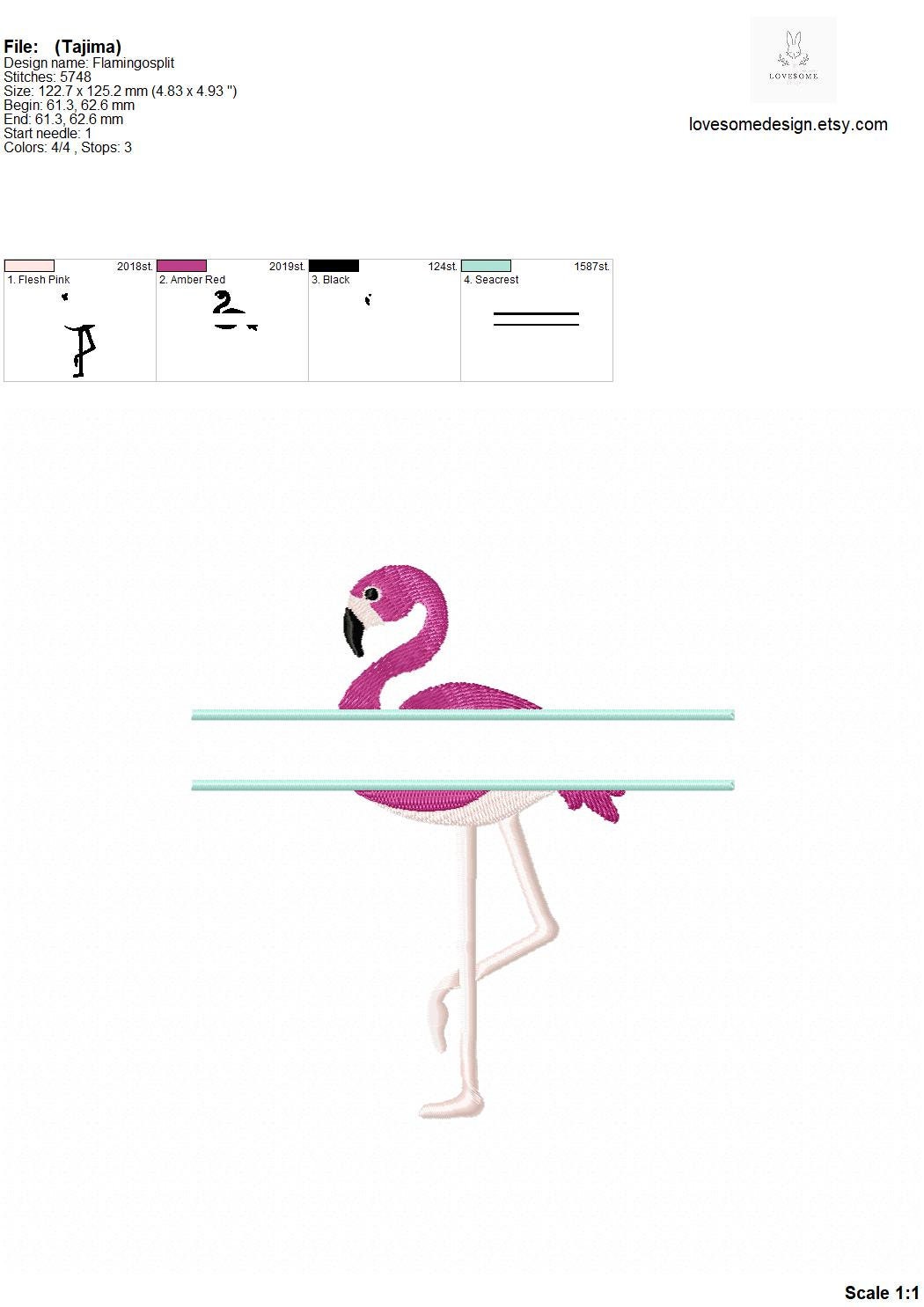 This listing includes one split flamingo design for machine embroidery in two sizes, each appr. in 4inch for 4x4 and and 5inch for 5x7 embroidery hoops.