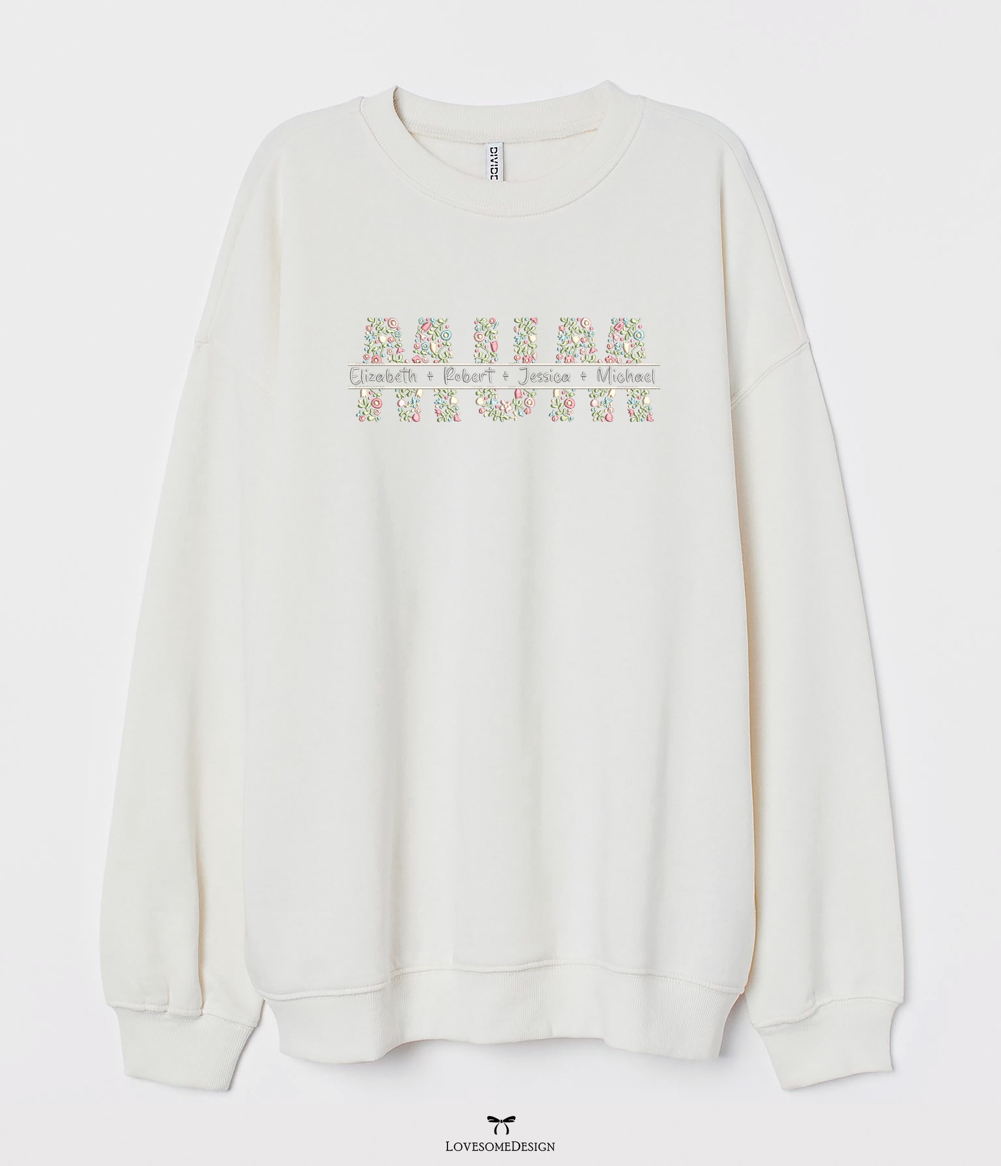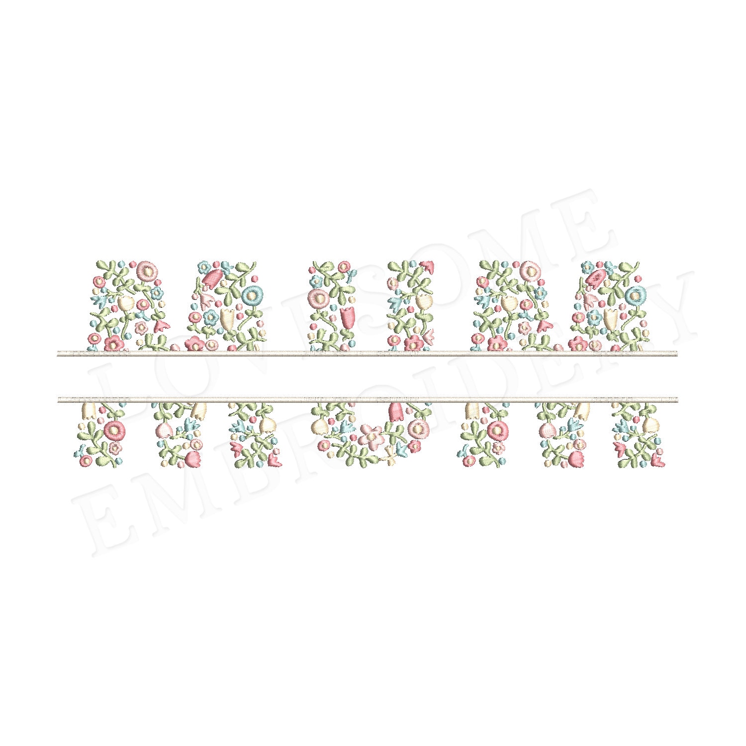 This listing features a machine embroidery file of floral fill split mum lettering in 10 inch size. You can customize by adding the text you wish. It would make a great mothers day gift when stitched with kids names in the split area.
