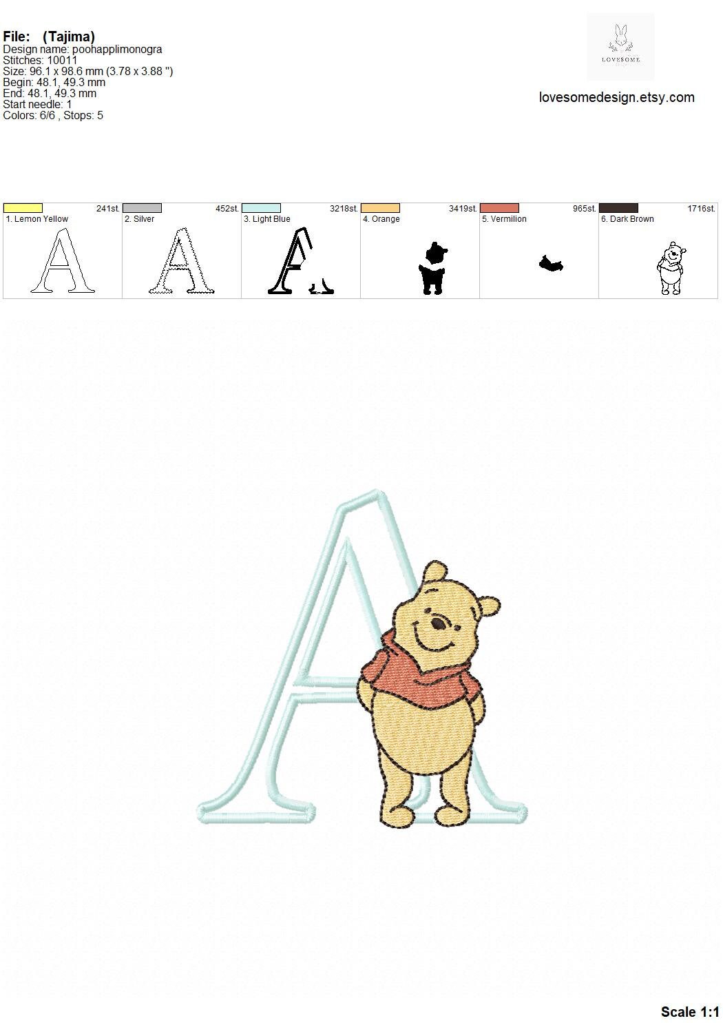 This listing features a machine embroidery font set which includes embroidery files of 26 uppercase applique monogram letters with Winnie the Pooh design in 4inch size. (For the whole set, pls see the listing images.)