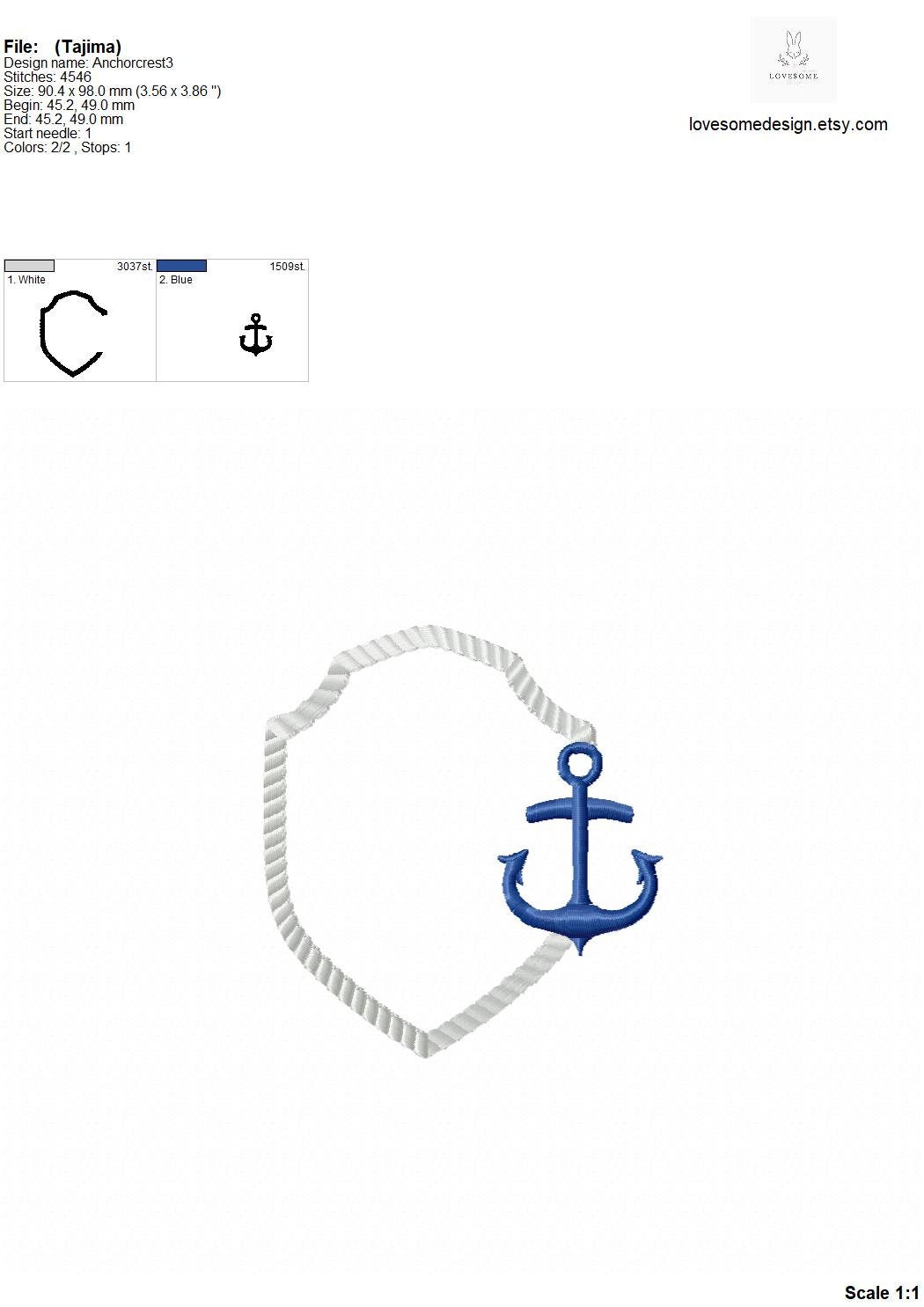 This listing includes one crest design in rope stitch with an anchor for machine embroidery in one size, each appr. in 4inch size.