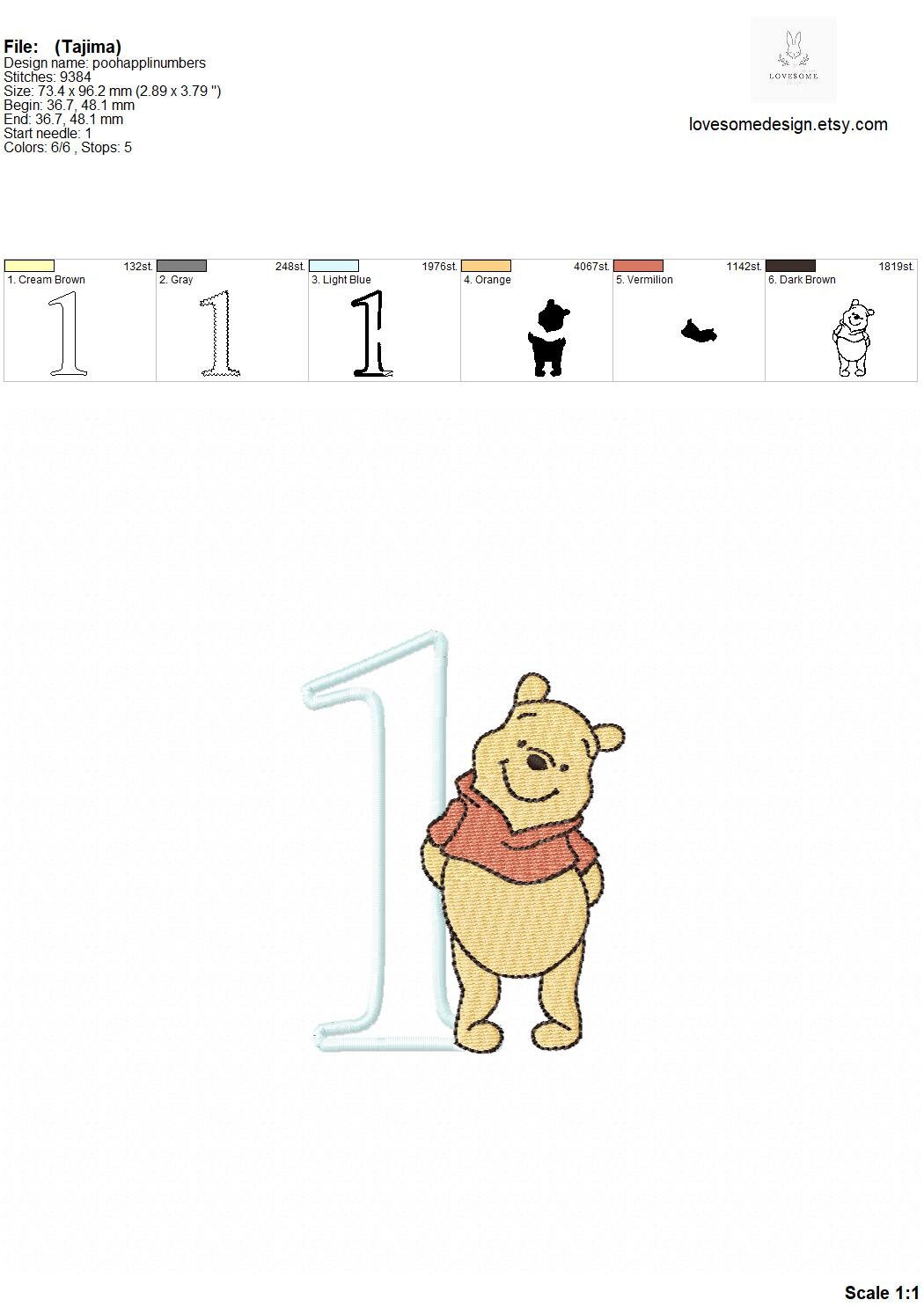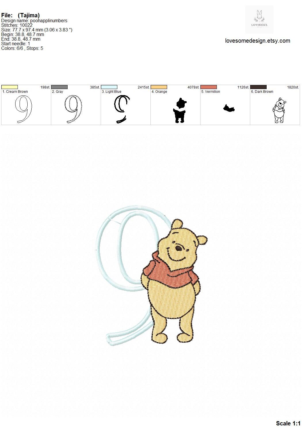 This listing features a machine embroidery numbers set which includes embroidery files of ten applique numbers (0-9) with Winnie the Pooh design in one size for 4x4 hoops for machine embroidery. (For the whole set, pls see the listing images.)