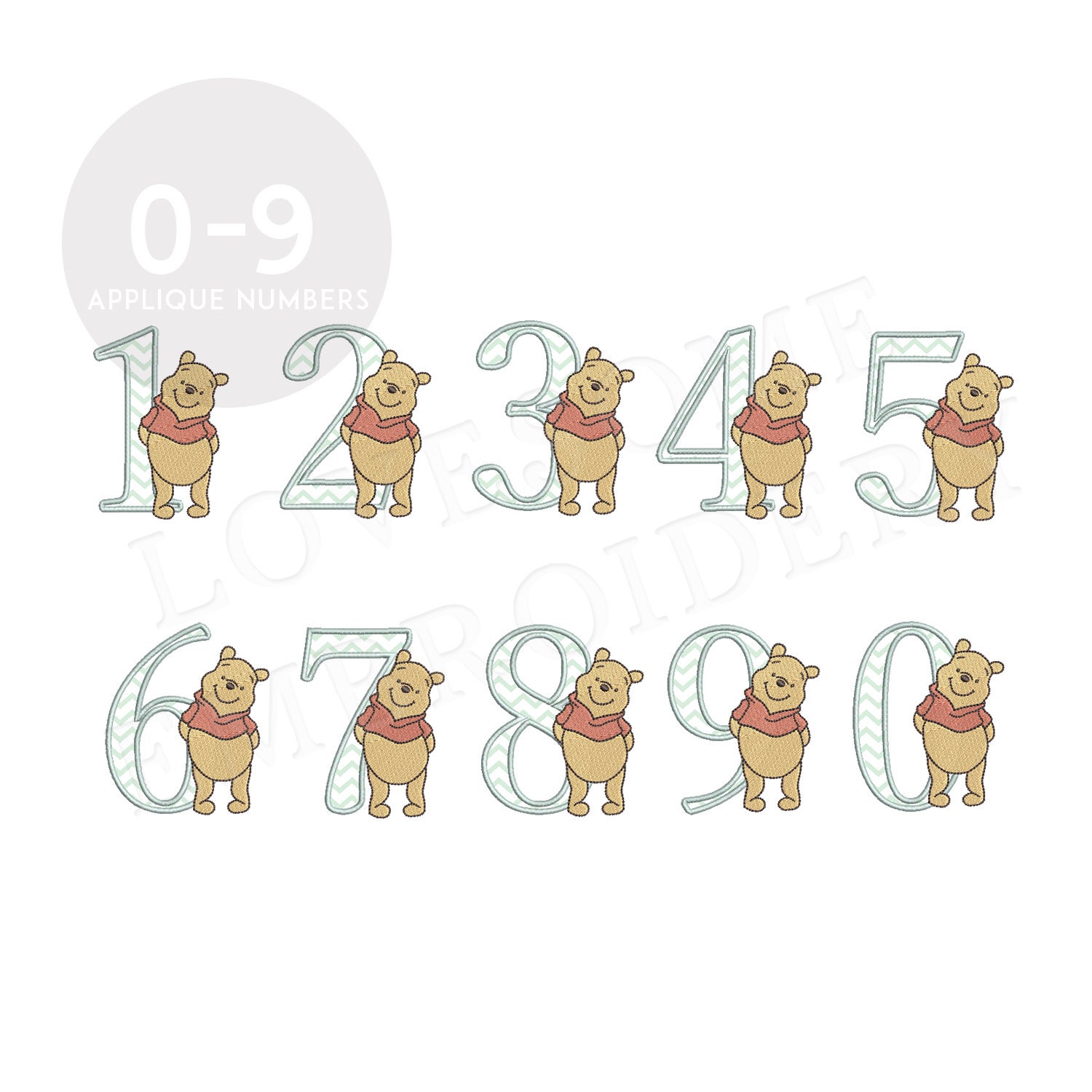 This listing features a machine embroidery numbers set which includes embroidery files of ten applique numbers (0-9) with Winnie the Pooh design in one size 5inch for machine embroidery. (For the whole set, pls see the listing images.)