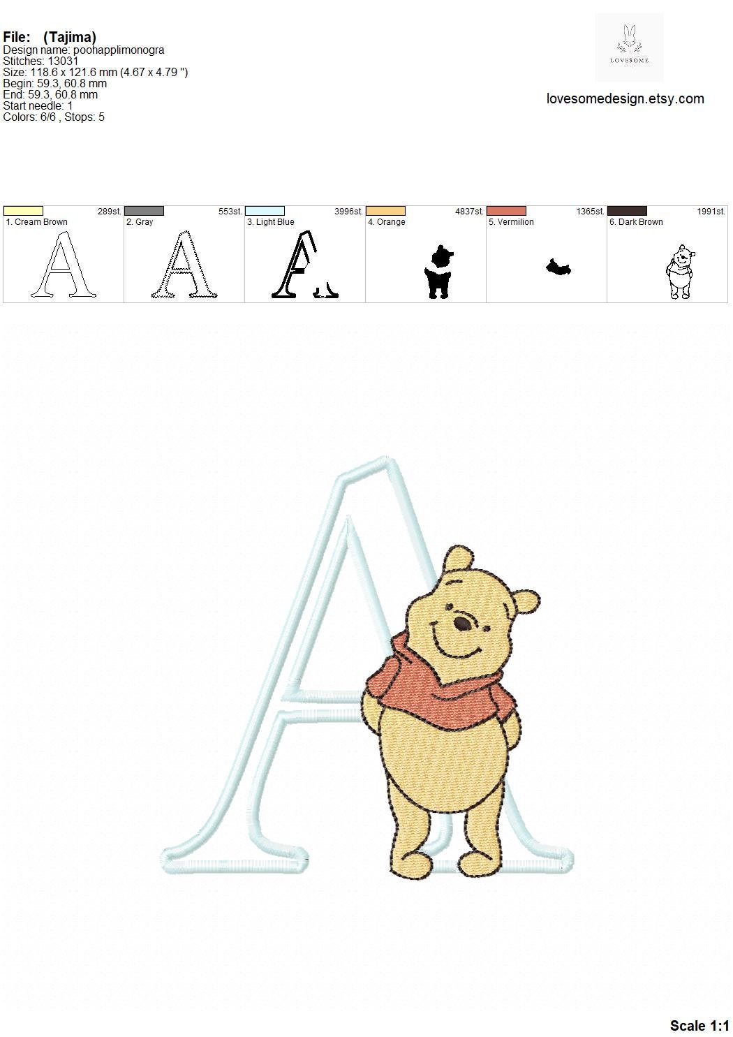 This listing features a machine embroidery font set which includes embroidery files of 26 uppercase applique monogram letters with Winnie the Pooh design in 5inch size. (For the whole set, pls see the listing images.)