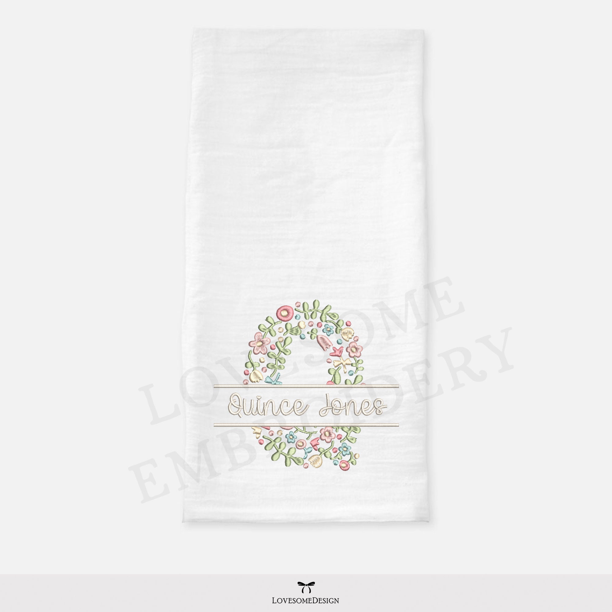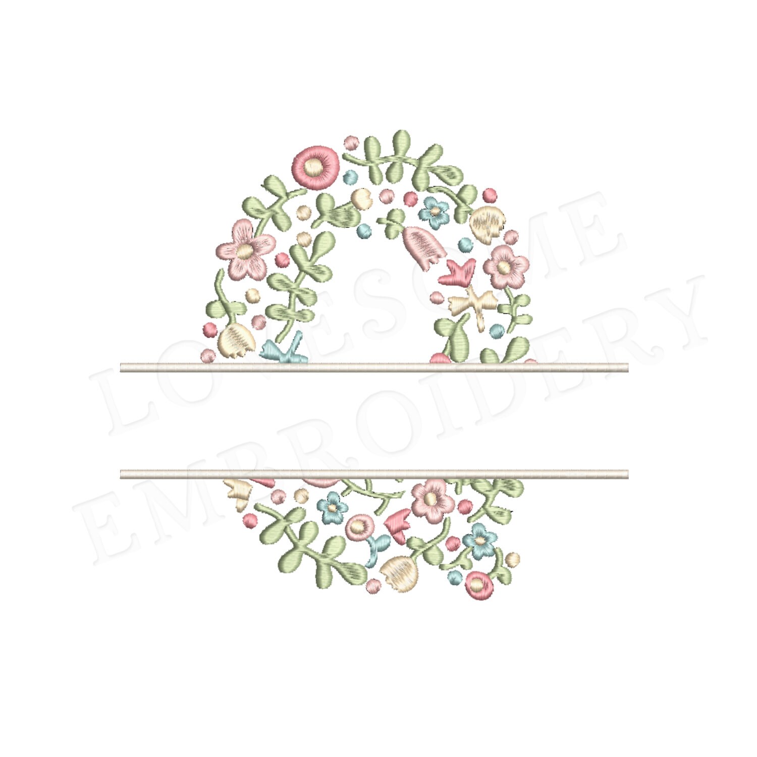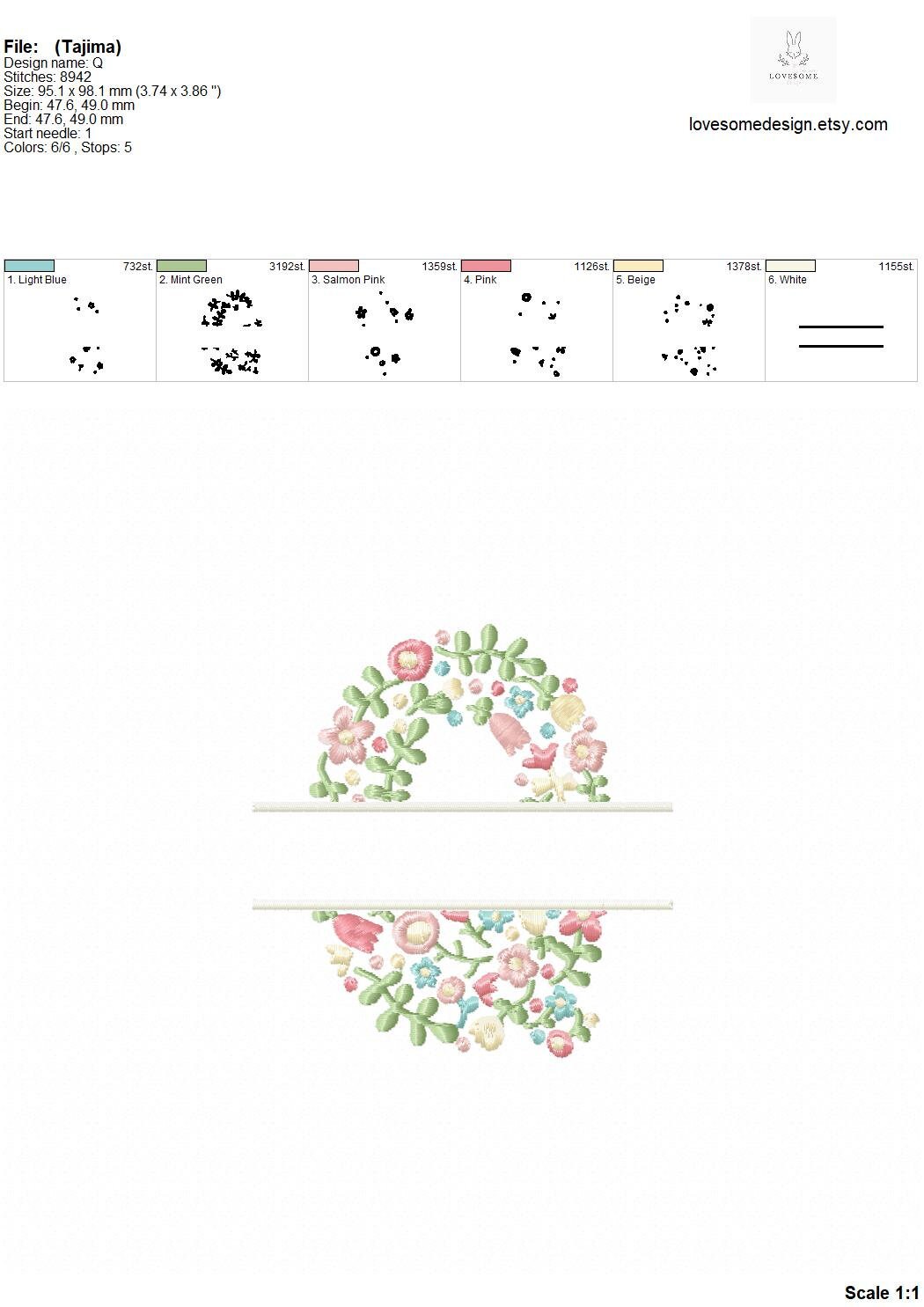 This listing features a machine embroidery file of one uppercase split letter "Q" which has a beautiful dainty floral fill design with pastel spring colors in 4inch size.