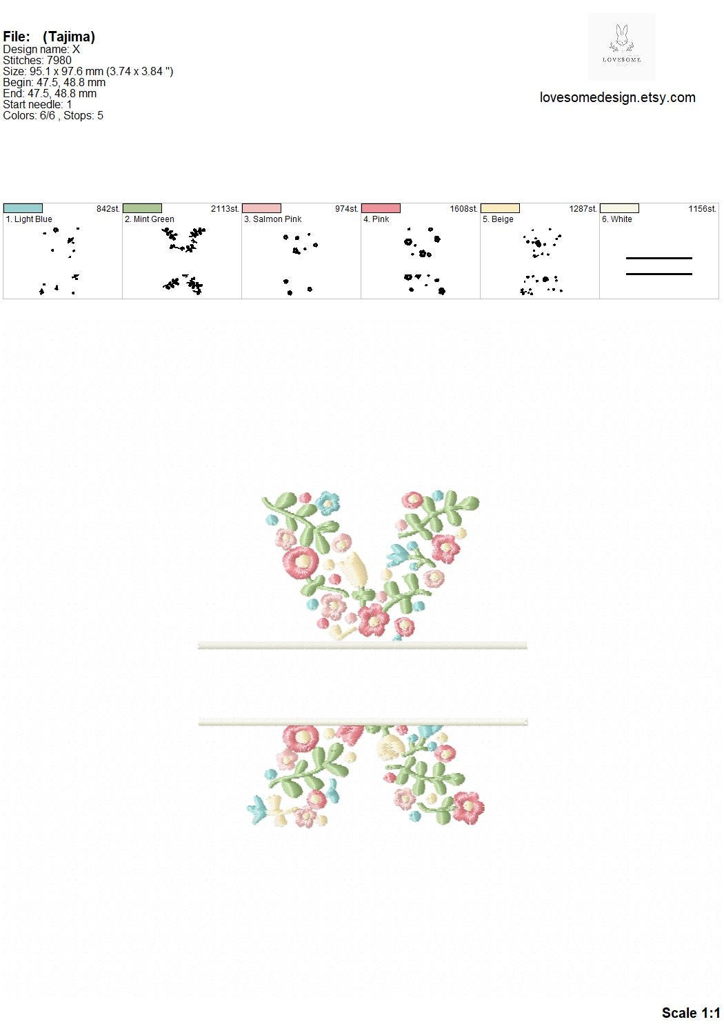 This listing features a machine embroidery file of one uppercase split letter "X" which has a beautiful dainty floral fill design with pastel spring colors in 4inch size.