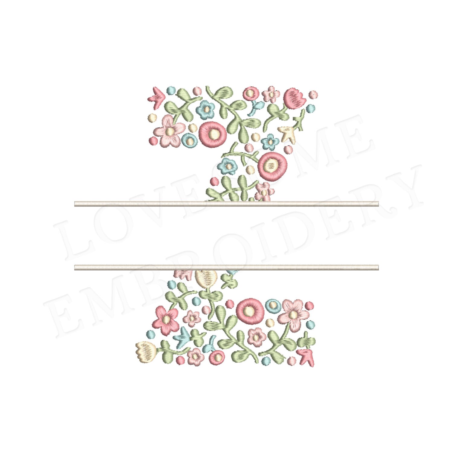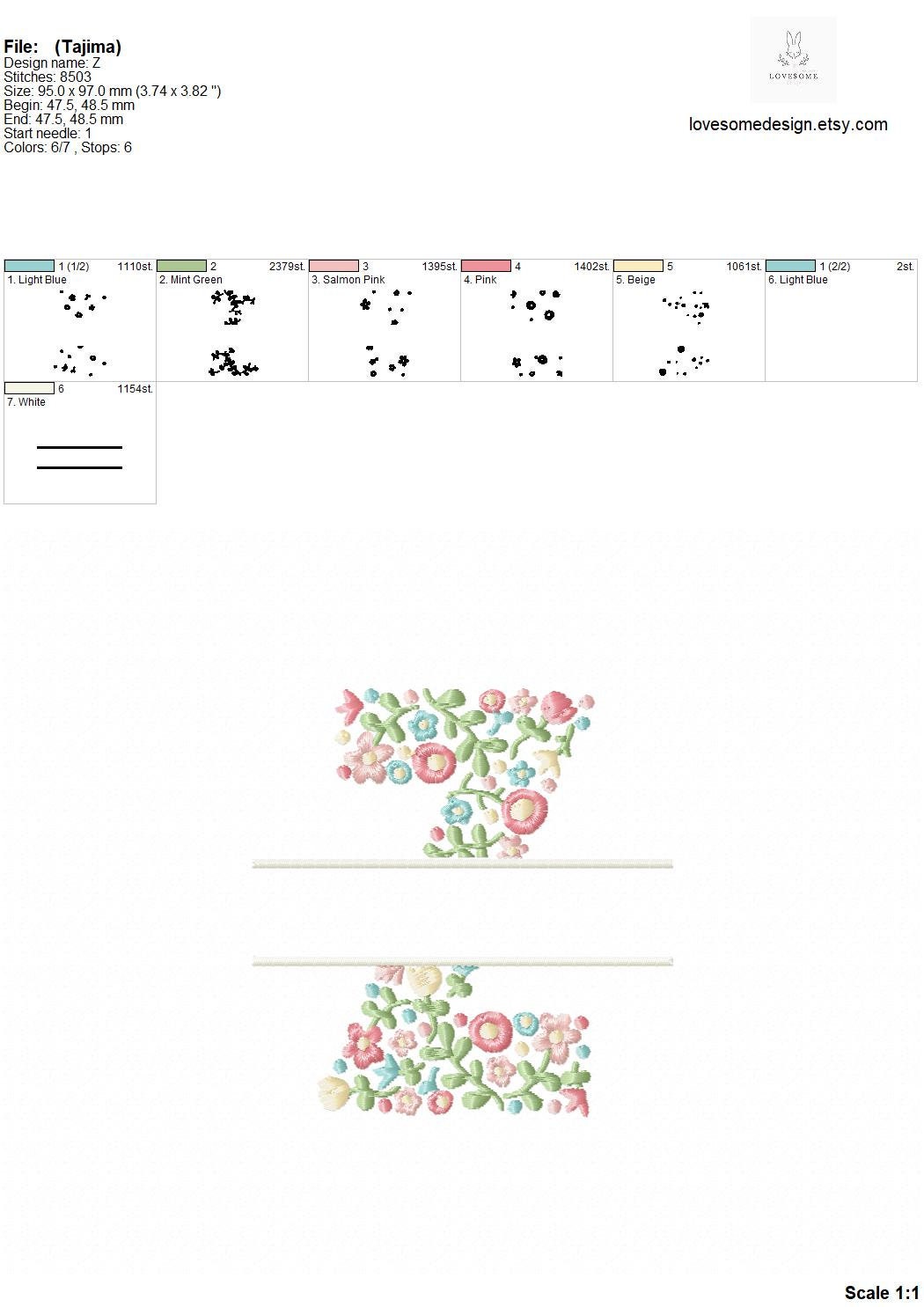 This listing features a machine embroidery file of one uppercase split letter "Z" which has a beautiful dainty floral fill design with pastel spring colors in 4inch size.