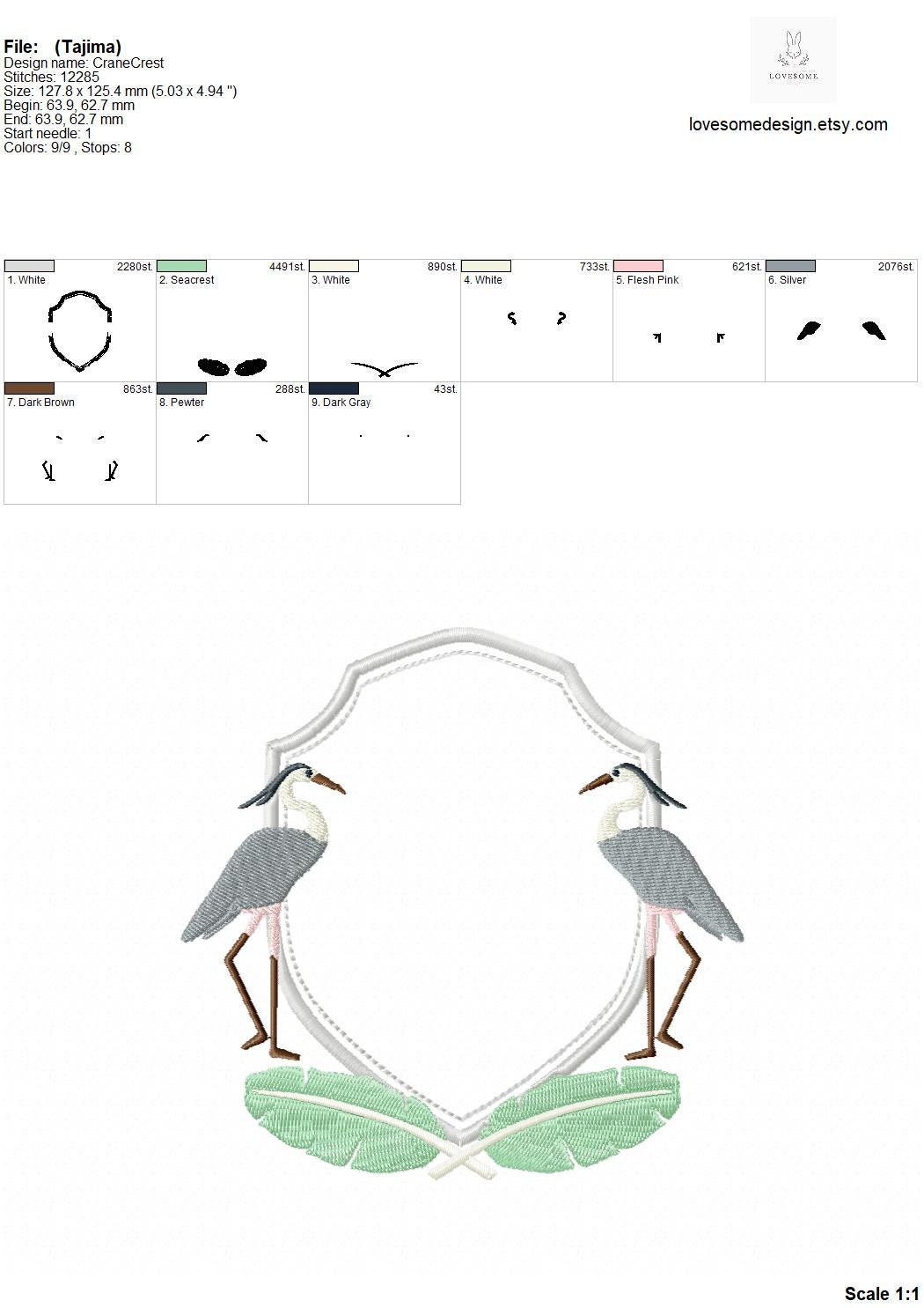 This listing includes one crest design with a pair of stylish crane birds and tropical leaves for machine embroidery in one size, each appr. in 5inch size.
