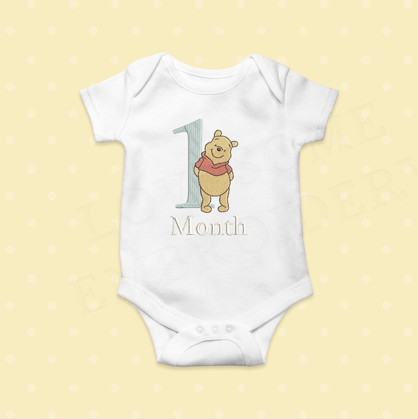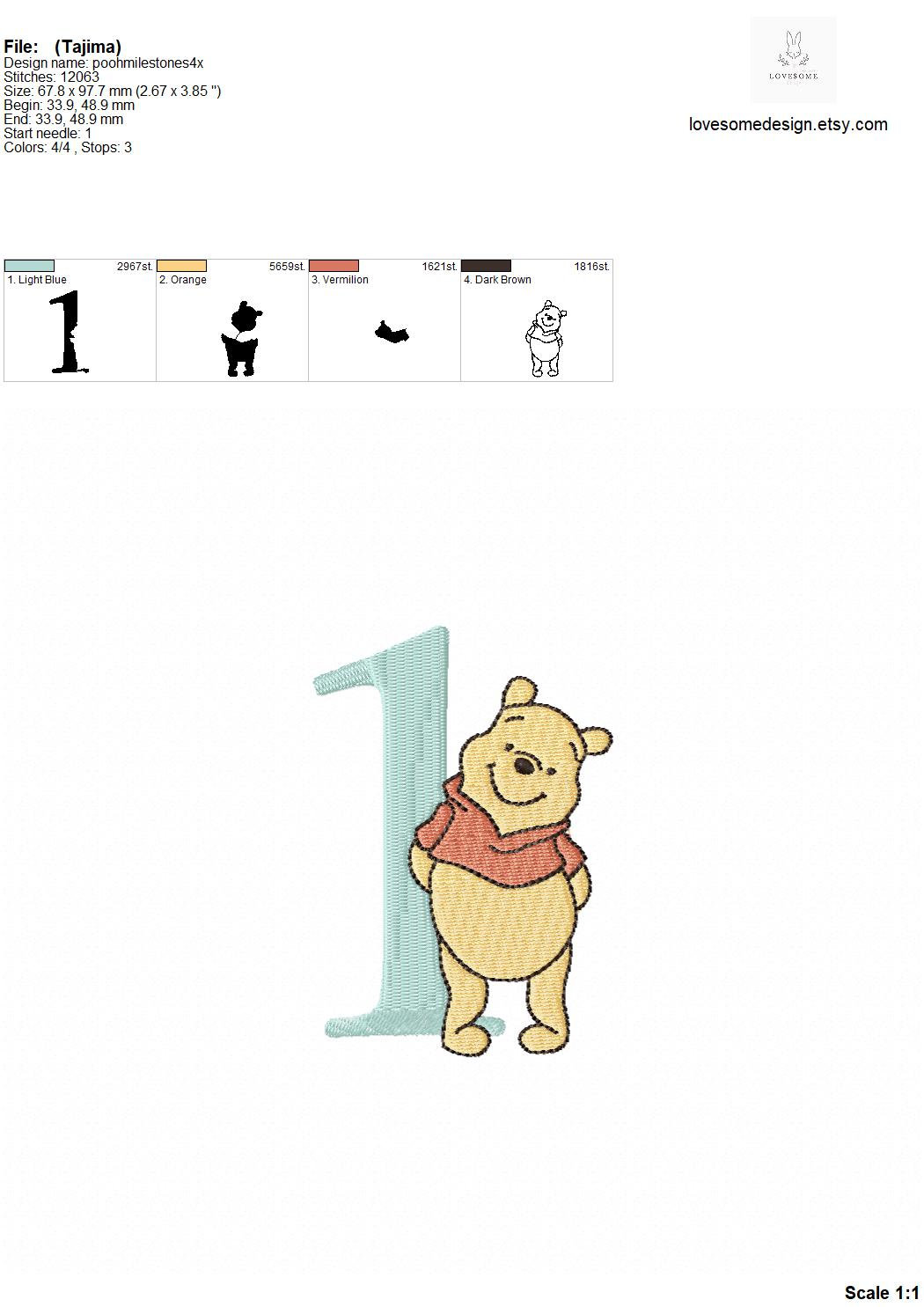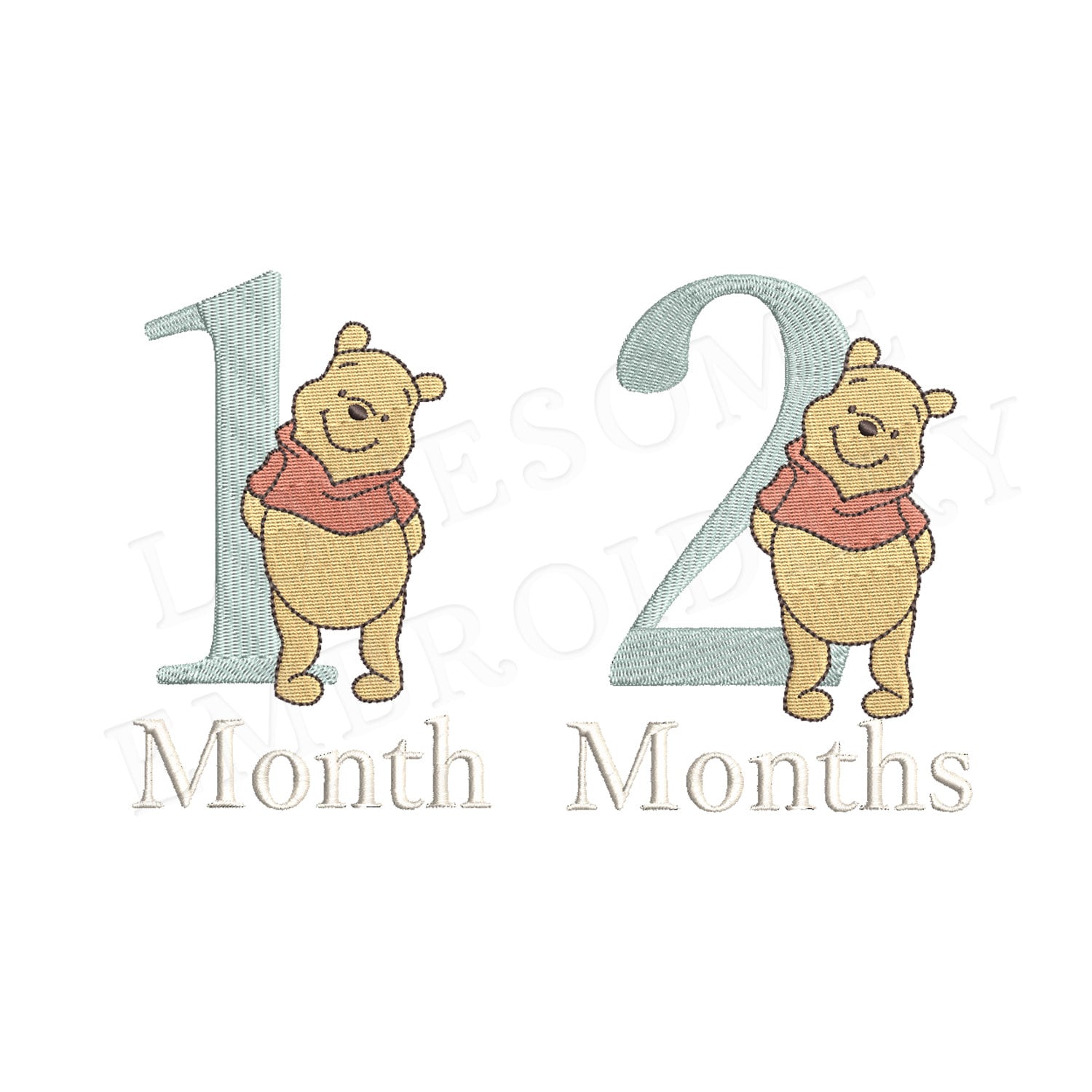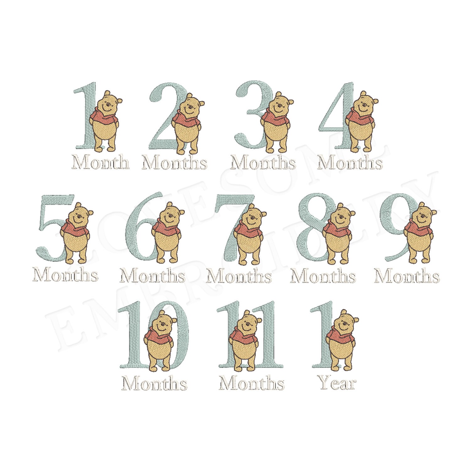 This listing includes number design set of Winnie the Pooh and three letterings "Month", "Months" and "Year" in 4 inch size, can be stitched with two hoopings on 4x4 embroidery hoops. (For the whole set, pls see the listing images.)